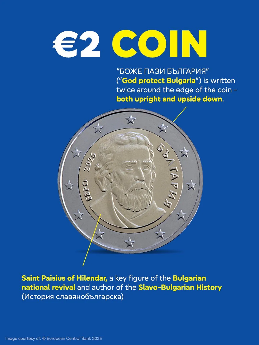 Moneda de 2 euro îl înfățișează pe Sfântul Paisie de la Hilandar. A trăit la muntele Athos, dar acolo a scris Istoria slavo-bulgară, o carte emblematică pentru istoria Bulgariei, și este văzut ca o figură principală a renașterii Bulgariei. Cartea le spunea bulgarilor istoria lor și îi îndemna să se elibereze de grecii și turcii care îi conduceau.