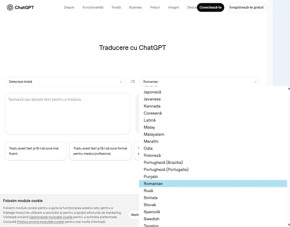 ChatGPT Translate s-a lansat cam pe sub mână la adresa chatgpt.com/translate. Știrea de ieri vorbea despre 50 de limbi, dar interfața inițială includea doar 24. Astăzi a apărut și limba română în opțiuni.