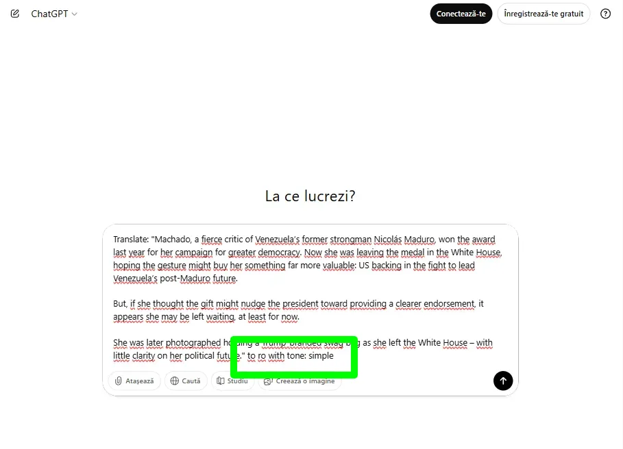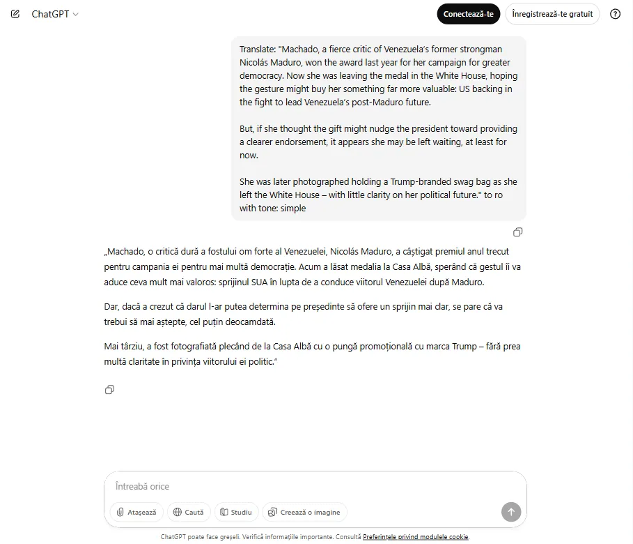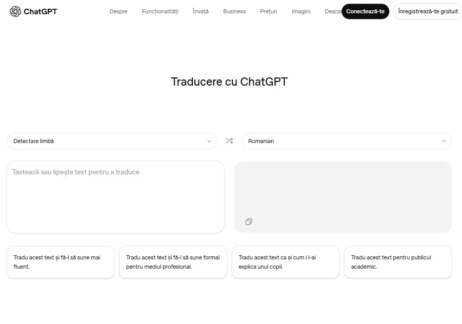 Cu toate acestea, la o apăsare de astfel de buton ești redirecționat tot pe site-ul principal ChatGPT.com, dar cu prompt-ul precompletat pentru AI. Și nici măcar nu-i un prompt bun, e scris în limbaj de mașină, cu “translate to ro” și “tone: simple”. Din testele mele, traducerile sunt foarte asemănătoare, nu vă așteptați la miracole.