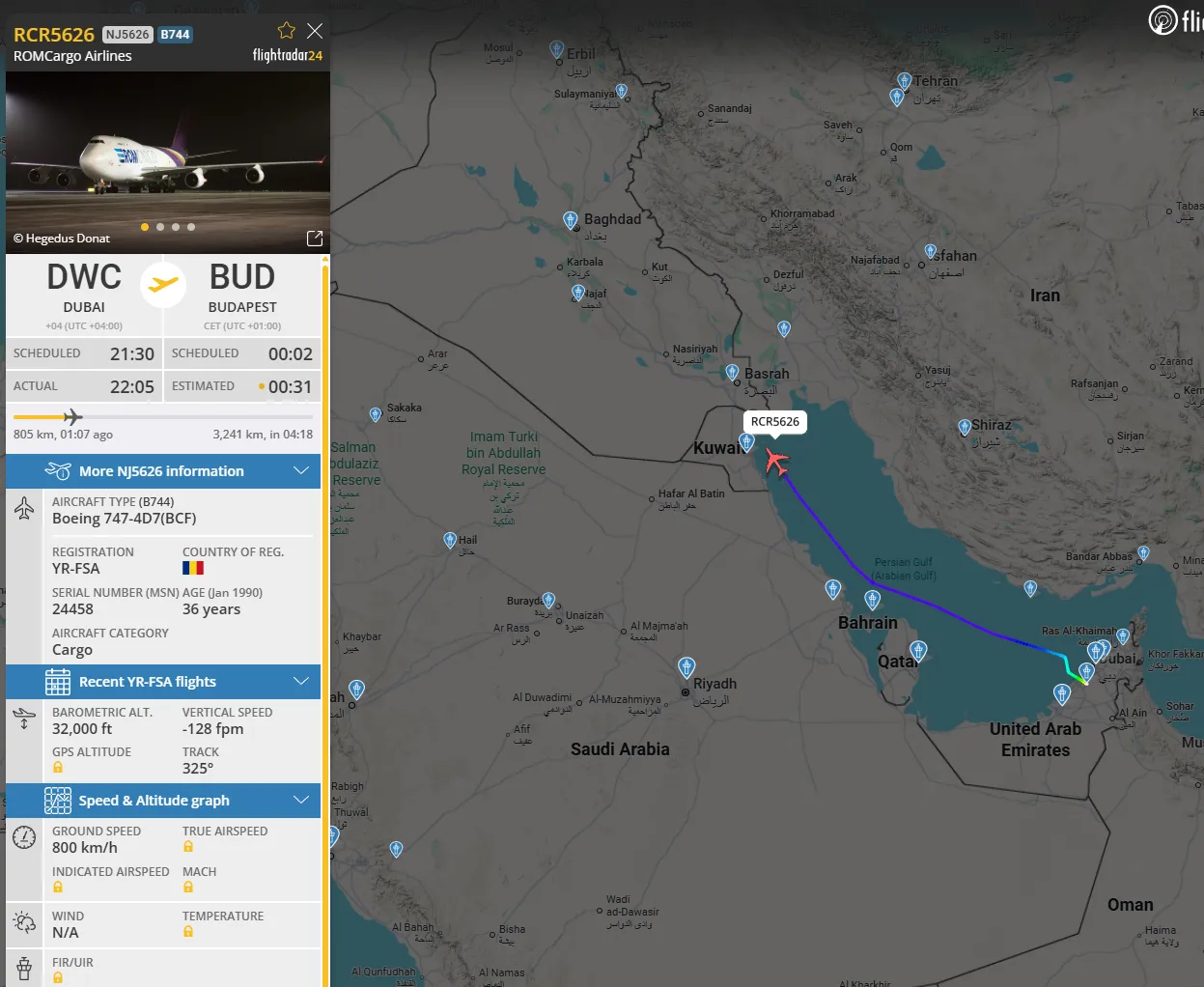 YR-FSA pare că zboară cel mai des pe ruta Budapesta-Dubai, probabil un contract cargo de transport pe această rută.