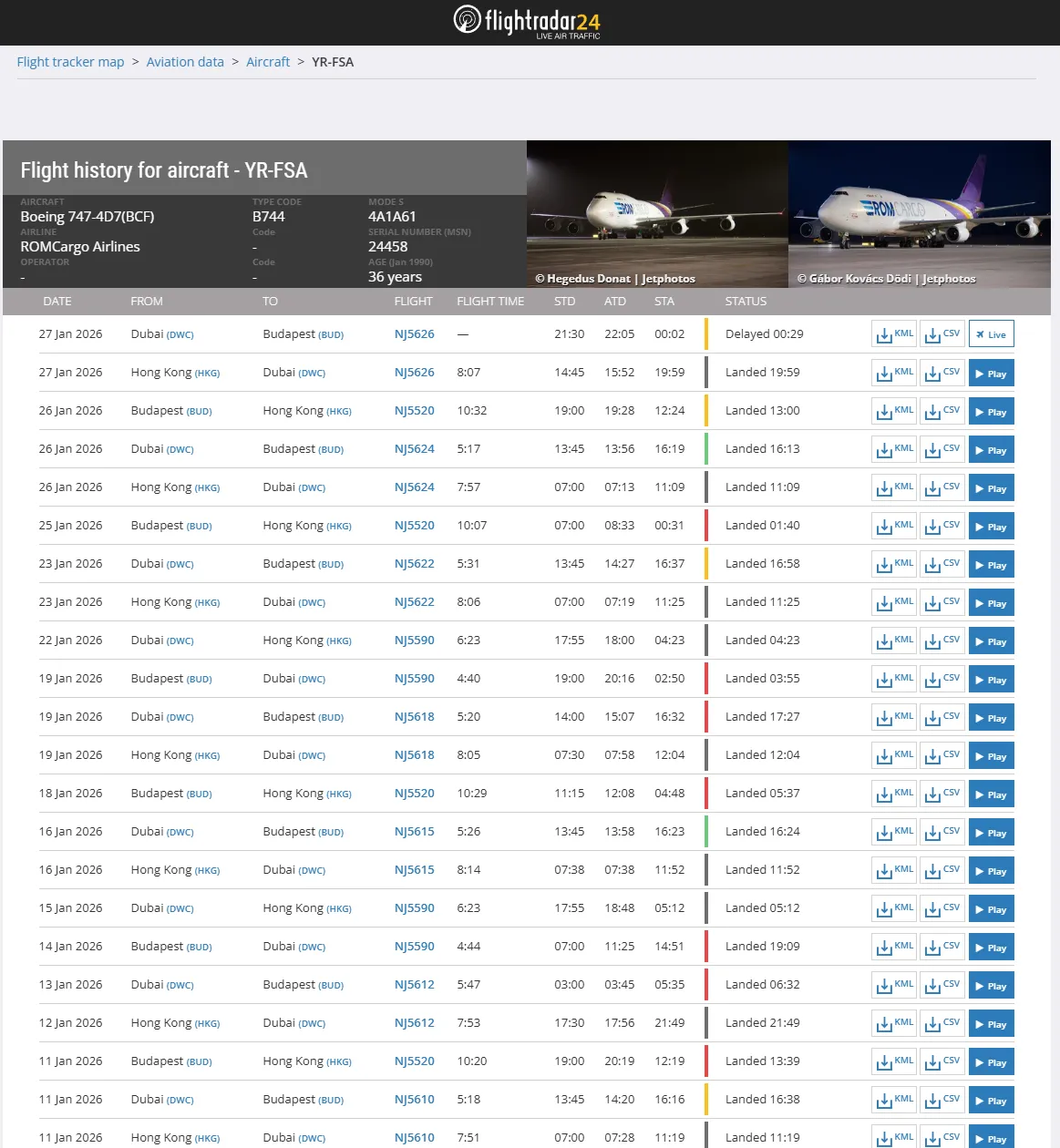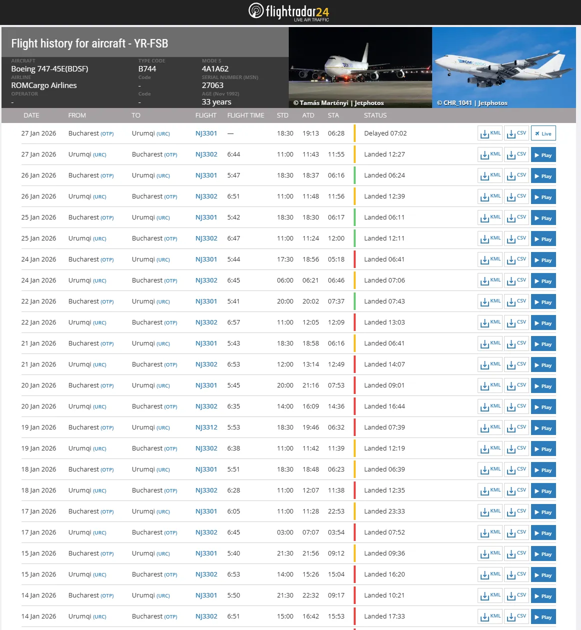 Ambele sunt deci avioane de marfă. YR-FSB pare că operează în general zboruri București-Urumqi și înapoi, probabil transportând marfă diversă din China. O dată la două zile poate fi văzut pe Otopeni.