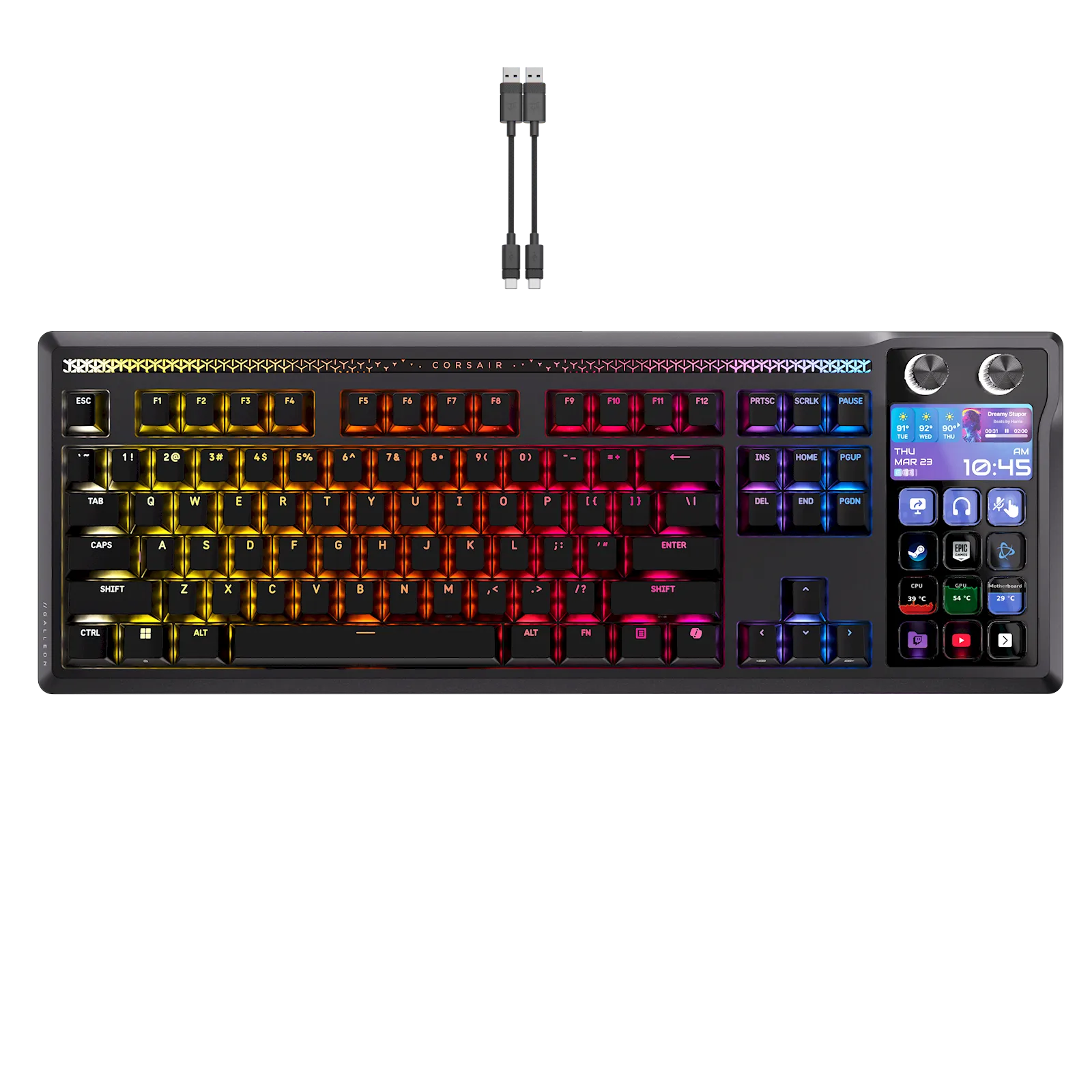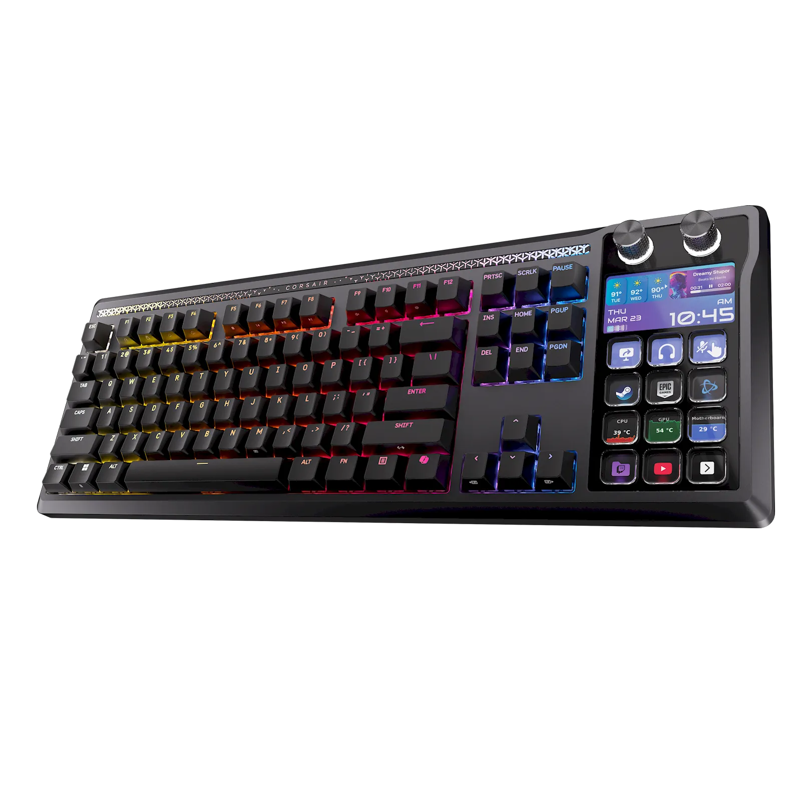 Corsair a lansat o tastatură care-mi place mult ca idee și sper să văd și altele pe piață. Se numește Galleon 100 SD și integrează o tastatură Stream Deck+ în locul blocului numeric din dreapta, cu tot cu afișaj și două butoane rotative.