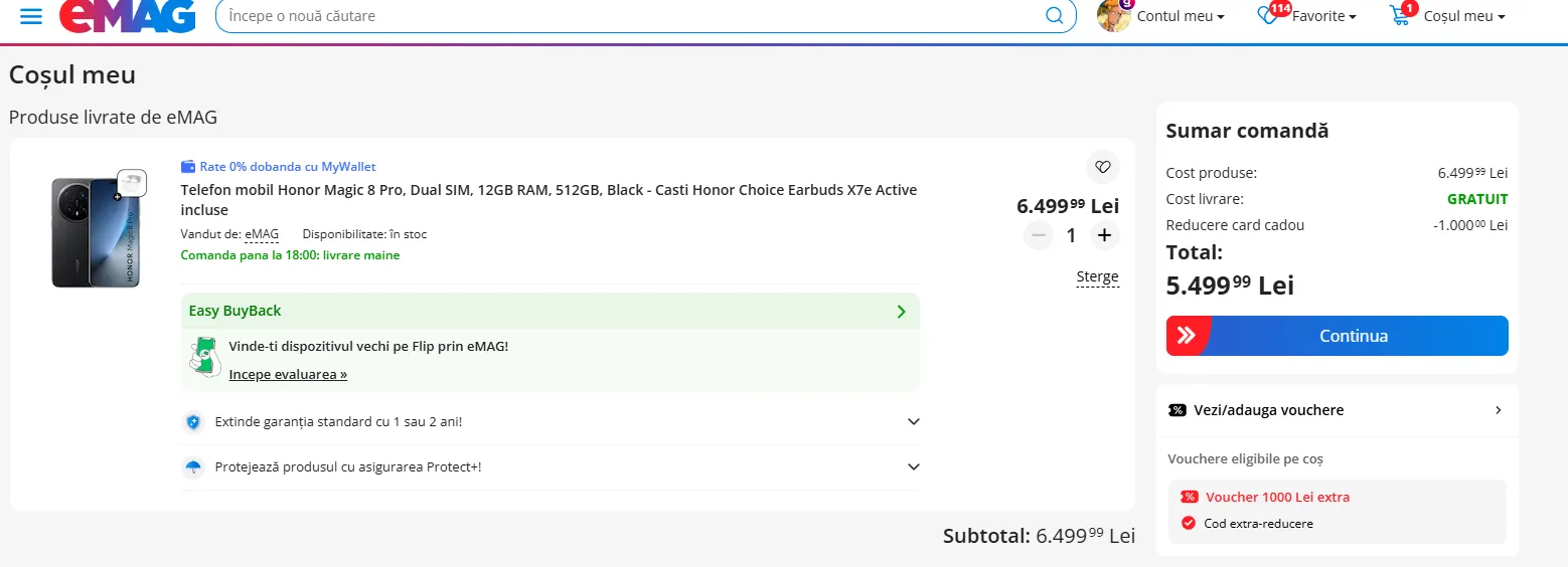 Telefoanele sunt de astăzi disponibile în magazine, găsiți Magic8 Pro la eMAG. Varianta de 512 GB costă oficial 6.499 lei, dar introduceți codul “honor” în coșul de cumpărături și prețul scade instant cu 1000 de lei pentru cele vândute de eMAG, desigur. Costă deci 5.499 lei și include și o pereche de căști Honor Choice Earbuds X7e Active, care sunt earbuds cu anulare activă de zgomot și autonomie totală de 40 de ore. Este o ofertă bună pentru un telefon nou.