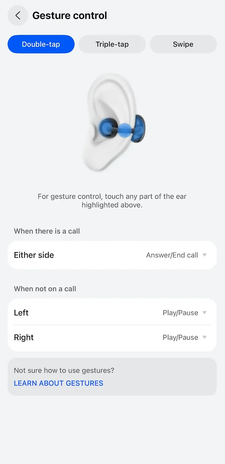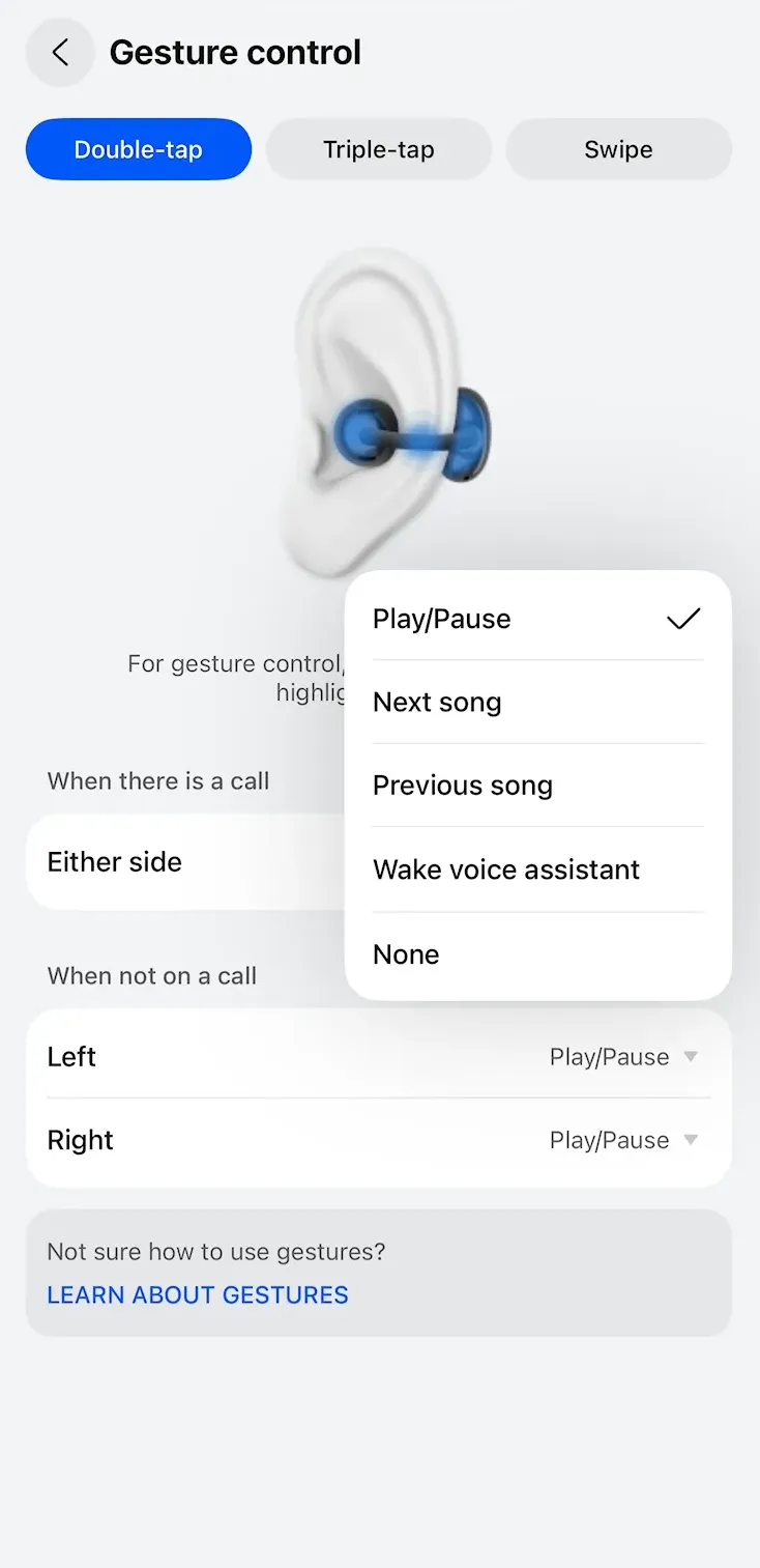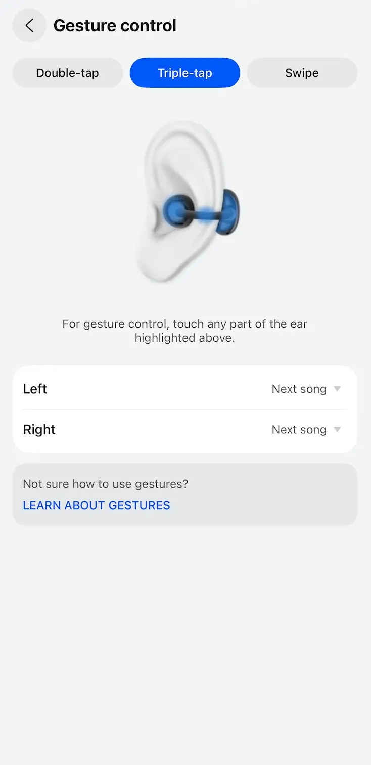 De asemenea, poți activa control independent pe fiecare cască. De exemplu, trei tap-uri pe casca stângă pot trece la melodia următoare, dar trei tap-uri pe casca dreaptă pot trece la melodia anterioară.