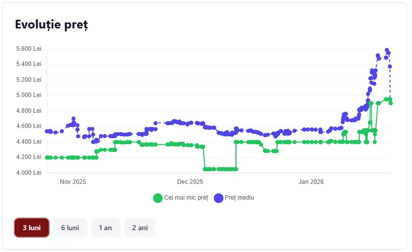 Situația stă la fel și pentru RTX 5080, care urcă în preț, iar stocurile par foarte limitate. Uitați evoluția prețului pentru cea mai ieftină dintre ele, un MSI RTX 5080: