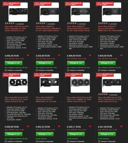 Dacă vă uitați la PC Garage pentru RTX 5070 Ti, observați că plăcile din stocul magazinului costă 4700-5100 de lei, în timp ce plăcile aflate “în stoc furnizor” costă între 5900 și 6500 de lei! Holy s.!