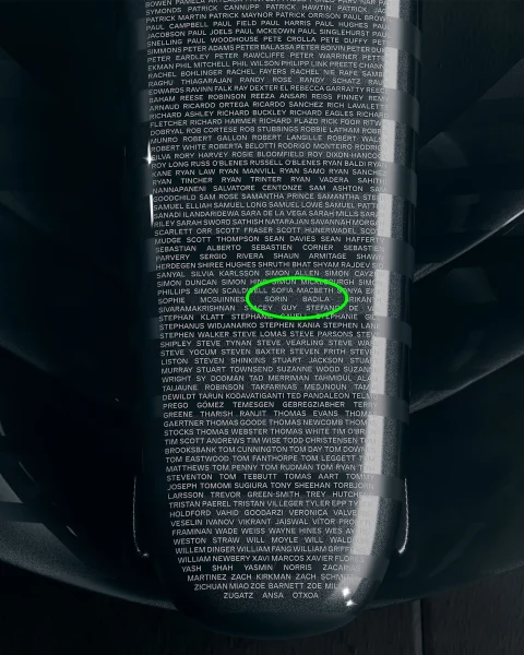 Așa zice contul oficial, “This one-off monochrome design features the names of the founding members of the team, displayed on the nose”.