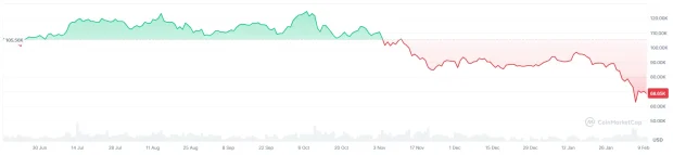O surpriză în ultima perioadă a fost scăderea semnificativă a Bitcoinului. Acesta a avut un all-time high pe 6 octombrie, pe la 126k dolari, iar prin noiembrie a scăzut prima oară sub 100k dolari. A fost însă constant pe acolo până la început de februarie, când a scăzut vertiginos spre 60k dolari, înainte de a se stabiliza pe la 68k-70k dolari.