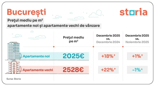 Iar prețul apartamentelor a crescut în decembrie, pentru cele noi, dar a scăzut un pic pentru cele vechi.