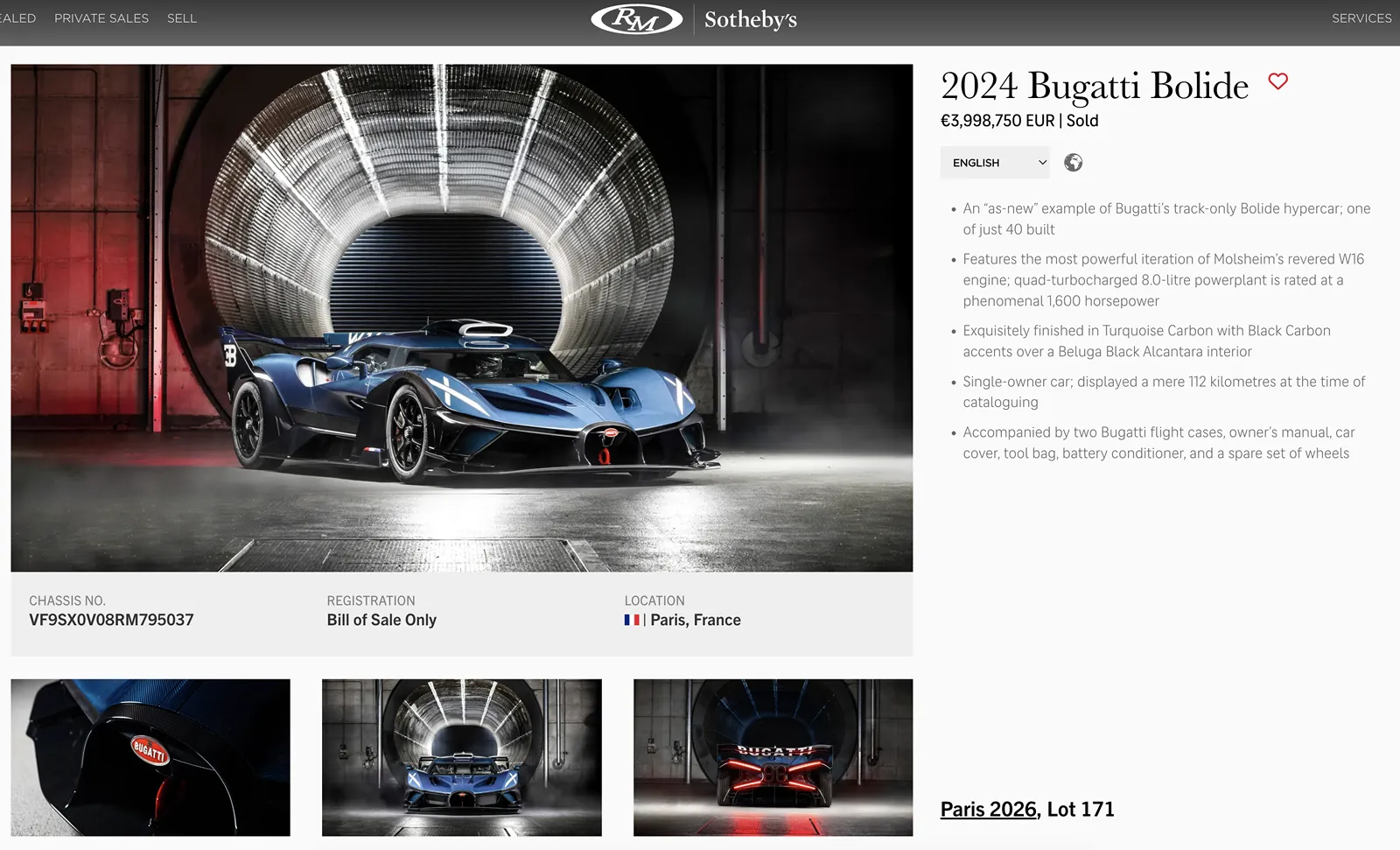 Un Bugatti Bolide din 2024 a luat 4 milioane de euro. S-au construit doar 40 de unități, are 1600 CP dintr-un motor de 8 litri și poate fi utilizat doar pe circuit. Din câte știu eu, ai chiar nevoie de o mică echipă pentru a-l conduce pe circuit. Ca în Formula 1, acestei mașini trebuie să-i atașezi imediat ce oprești niște ventilatoare pentru răcire, deci ai nevoie de vreo doi oameni care să te ajute.
