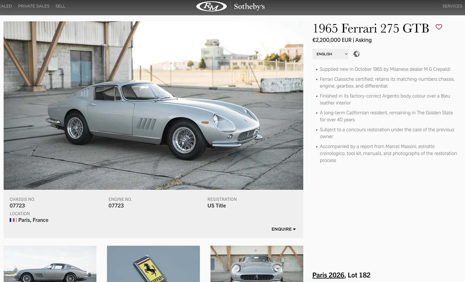 Un alt Ferrari foarte frumos din 1965, un model 275 GTB, nu a fost vândut. Prețul a urcat până la 1,9 milioane, dar proprietarul voia mai mult.