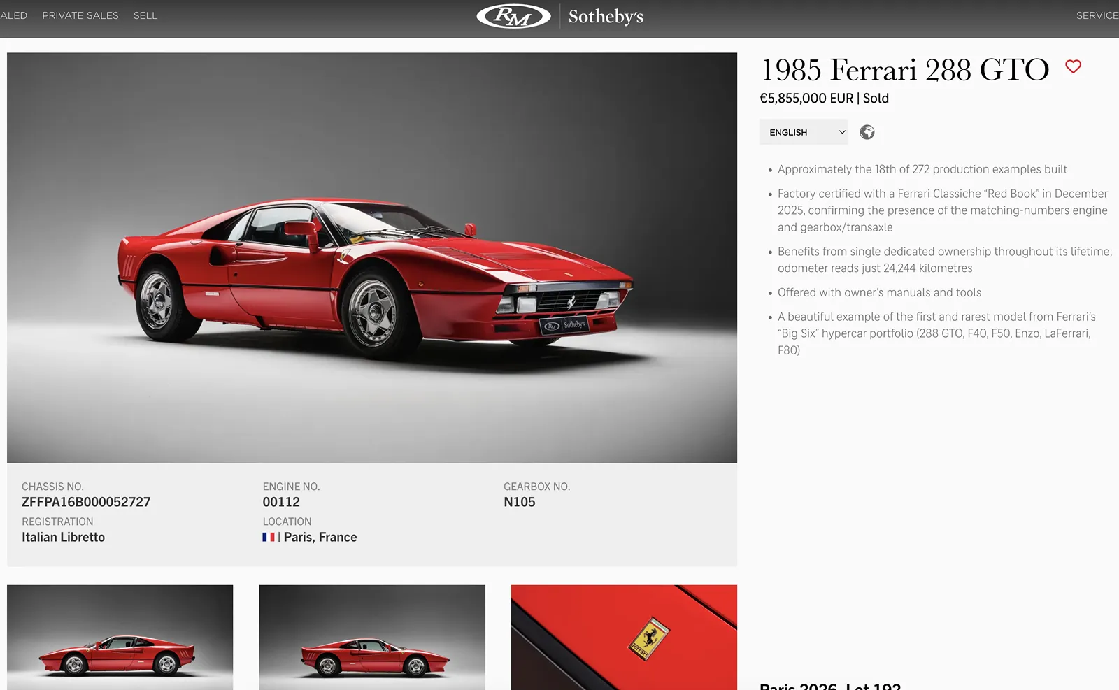 Acesta este un Ferrari 288 GTO din 1985, unul dintre cele 272 de exemplare produse. Un singur proprietar, 24.000 de kilometri rulaj. S-a vândut cu 5,8 milioane de euro.