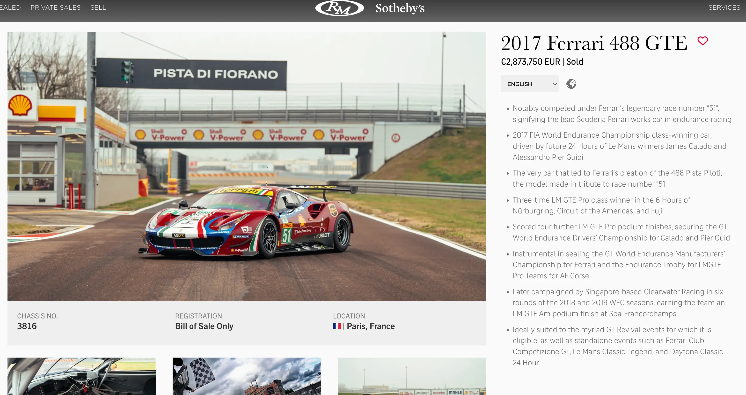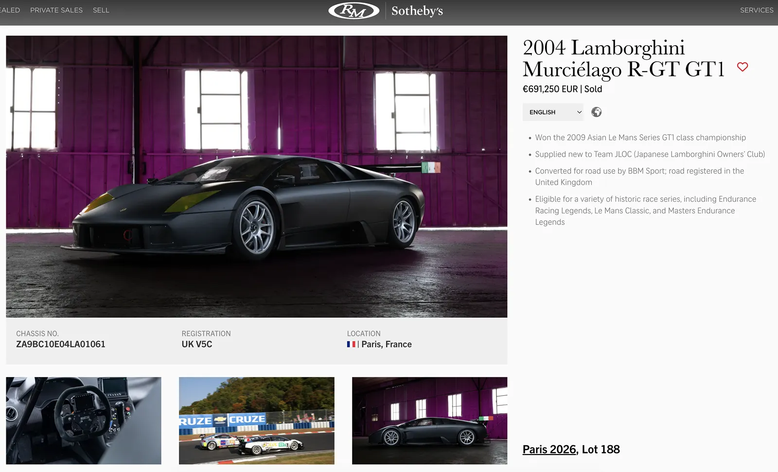 Un Murcielago GT-R GT1, ediție de curse convertită apoi în road-legal, și vreo două Ferrari produse pentru curse auto, cu rezultate notabile în diverse campionate, s-au vândut de asemenea pe sume mari.