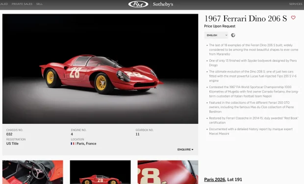 Un exemplu bun în acest sens este mașina de mai jos, un Ferrari Dino 206 S din 1967, ultimul dintre cele 18 construite. De fapt, este unul dintre cele 13 carosate Spider și unul dintre cele două cu un motor V6 mai puternic decât celelalte.