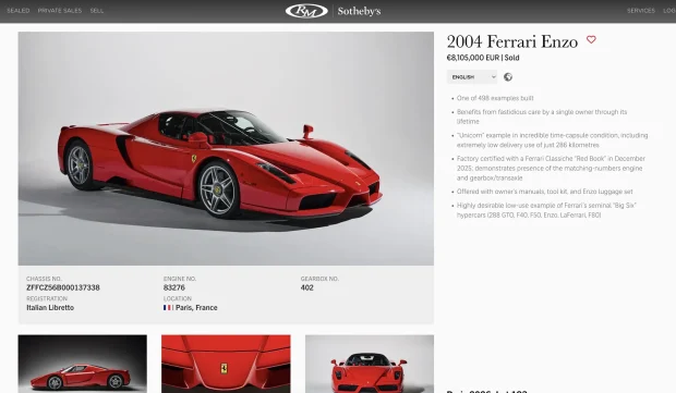 Trecând la mașini, însă, un Ferrari Enzo din 2004, cu doar 286 de kilometri la bord și având un singur proprietar în toți acești ani, s-a vândut cu 8,1 milioane de euro.