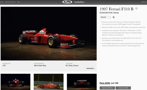 Apropo, Sotheby’s are la vânzare un monopost Ferrari de Formula 1, condus cândva chiar de Michael Shumacher într-o cursă, pentru 5,5 milioane de euro.