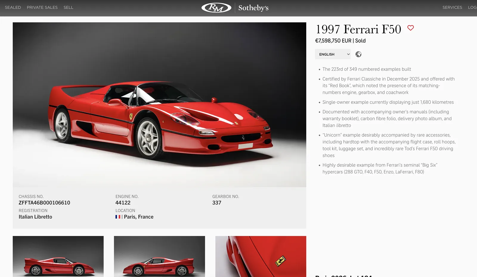Și poate că mergea un pic condus. Cu o săptămână înainte, în Arizona, Sotheby’s a vândut un alt Enzo cam pe aceeași sumă, dar acela avea 1200 de kilometri la bord. Cineva măcar a dat niște ture de circuit cu el.