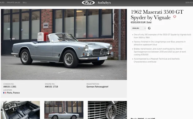 Un Maserati 3500 GT Spyder, care arată super, s-a vândut cu 320.000 de euro.