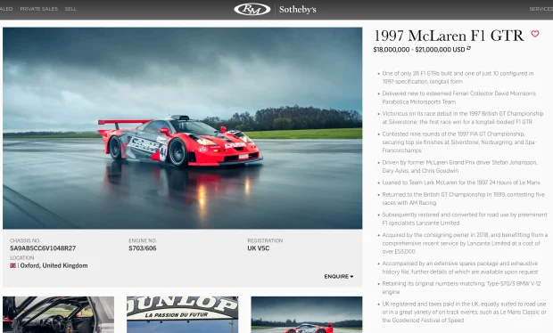 Ca să încheiem însă glorios, Sotheby’s vinde sau va vinde în curând un McLaren F1 GTR din 1997, ediția de curse. Această mașină chiar a câștigat cursa GT de la Silverstone, iar după o vreme a fost convertită în road-legal. Prețul estimat este între 5 și 18 milioane de euro.