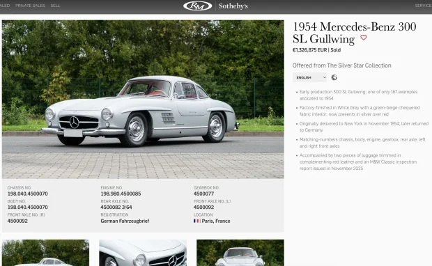 Un Gullwing s-a vândut cu 1,3 milioane euro.