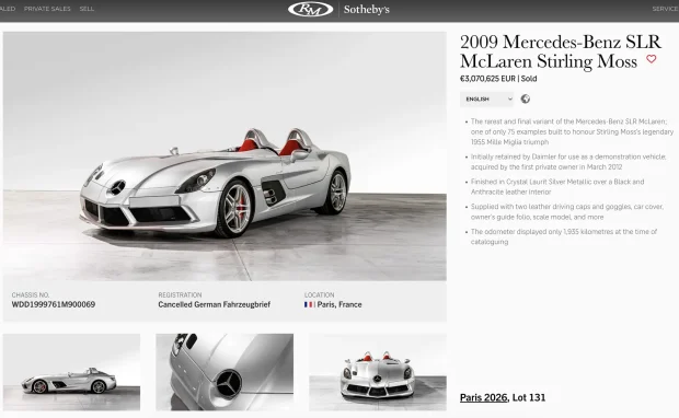 Un Mercedes SLR McLaren, ediția Stirling Moss care nu are nici măcar parbriz, cu 2000 de kilometri la bord, a luat 3 milioane de euro.