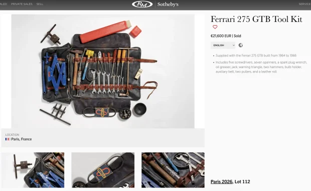 Spuneam despre Ferrari. De exemplu, o trusă de scule Ferrari, livrată în anii ’60 cu un 275 GTB, s-a vândut cu 21.600 de euro. Sunt doar scule, nimic special dincolo de originea lor, nu au nici sigla Ferrari pe ele. Astfel de pachete sunt însă rare și dorite de colecționari.