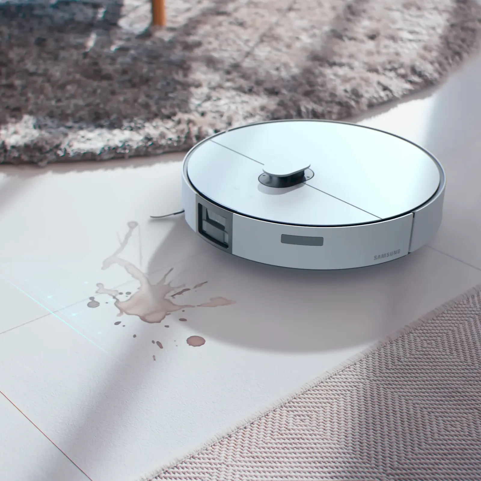 Și nu doar detectează obiecte mici, ci le recunoaște. AI-ul este bun la asta, după cum spuneam, iar al robotului a fost antrenat pe 1,7 milioane de obiecte. De exemplu, acest robot aspirator Samsung Bespoke AI Jet Bot Steam Ultra poate face diferența între lichid pe jos și o pată uscată de lichid. Lichidul poate fi evitat sau șters cu mopul (aspiratorul poate decide asta în funcție de culoarea lui), pe când o pată trebuie ștearsă.