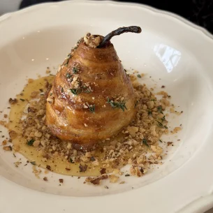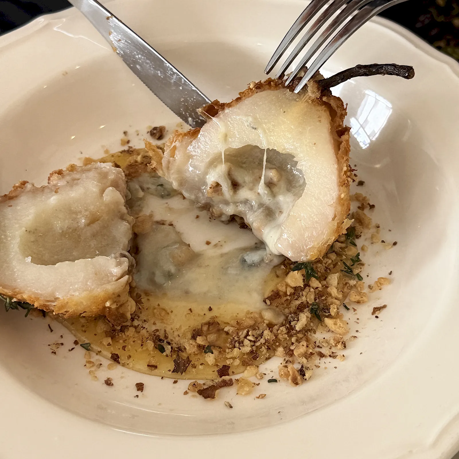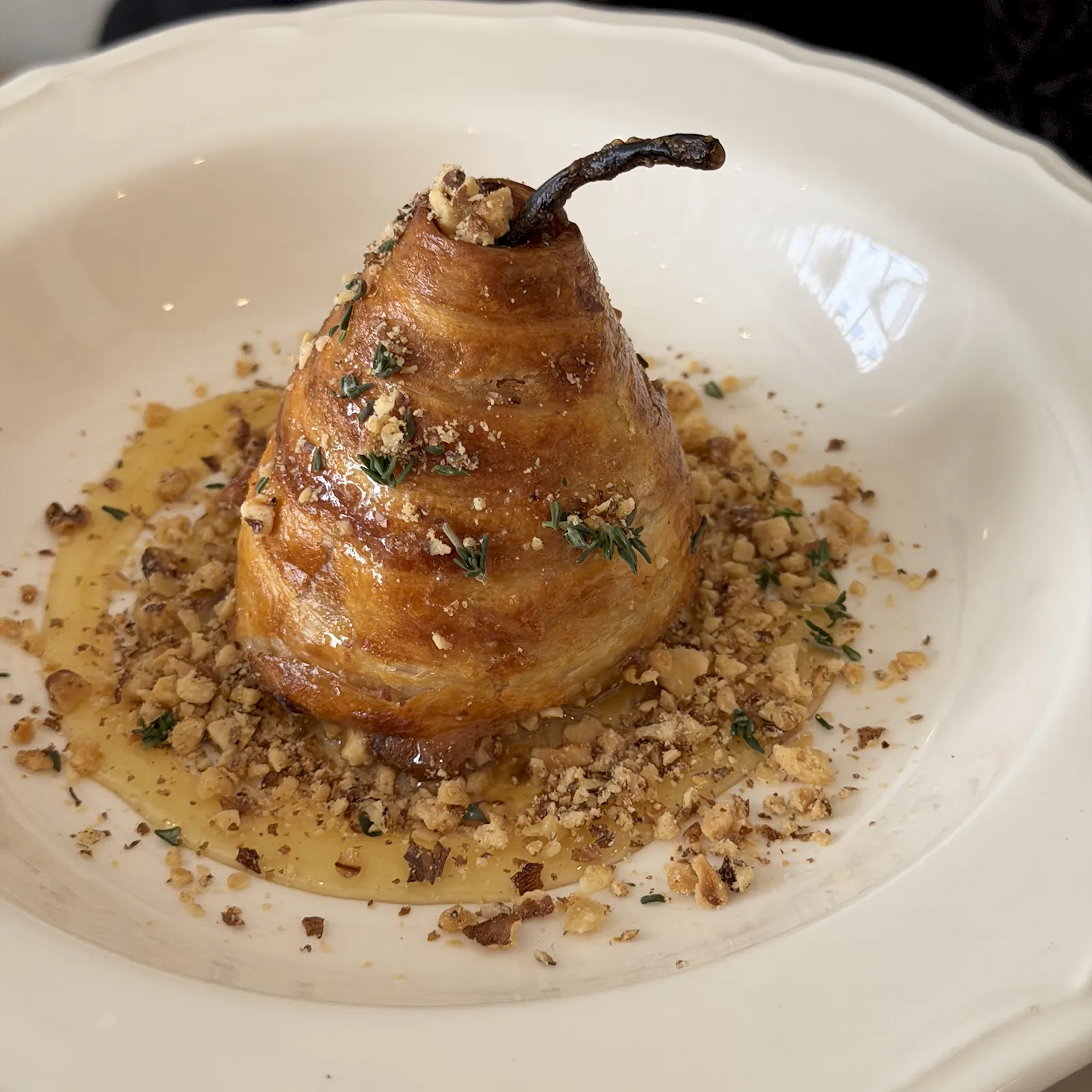 Iată mai jos și un Nobility in a puff shell, care nu este desert, ci un preparat din meniul de aperitive. Pară coaptă învelită în foietaj cu unt și umplută cu gorgonzola, acoperită cu nuci prăjite, miere și cimbrișor, zice meniul. Matilda zice că a fost bună.