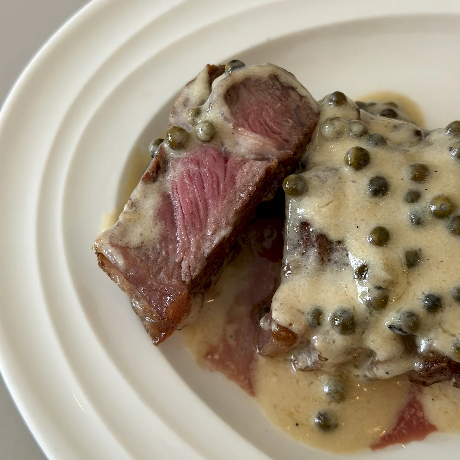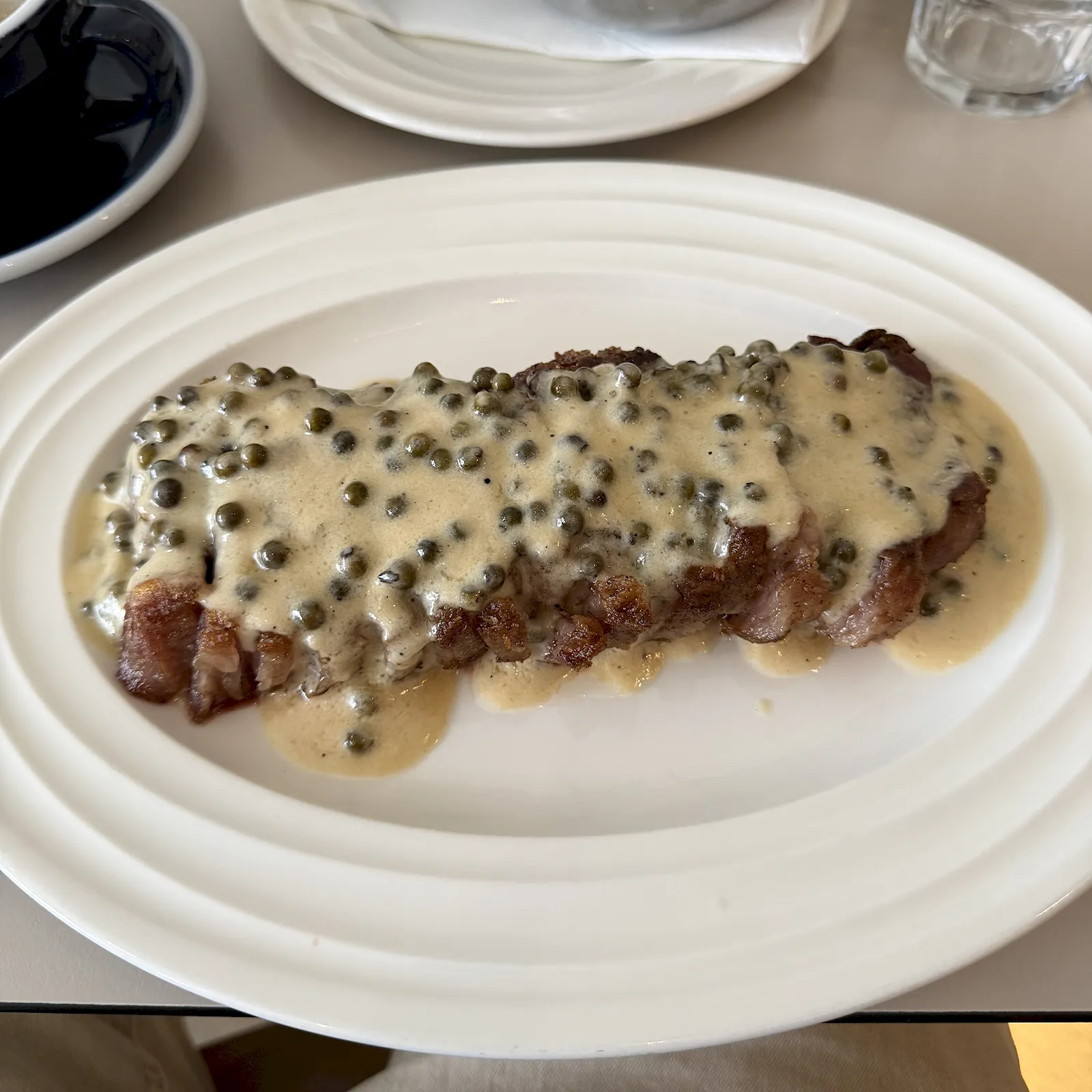 Friptura a venit gătită exact cum am cerut-o și acoperită cu un sos de piper verde. Porția mi s-a părut mare, după cum spuneam, și gustoasă. În meniu scrie că este antricot de vită, adică rib-eye. Eu m-aș putea jura că este de fapt vrăbioară, având în vedere forma ei și micul strat de grăsime aflat la un capăt al fiecărei feliuțe, dar poate fi și antricot, depinde de vacă și zona din care s-a tăiat carnea.
