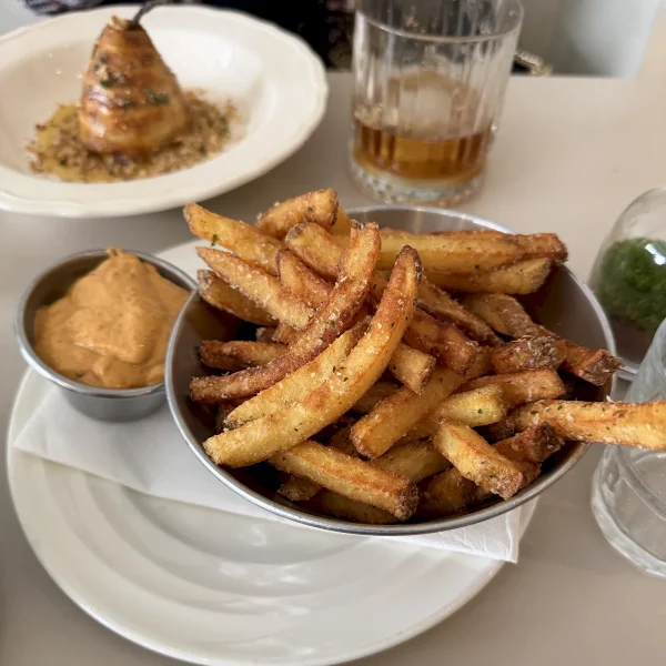 Cartofii prăjiți au fost excelenți. Sunt dublu prăjiți, adică întâi îi prăjesc la o temperatură mică pentru a-i găti parțial, apoi teoretic sunt răciți și chiar congelați și apoi, la final, prăjiți a doua oară la temperatură mare pentru a lua doar crustă și culoare plăcută. Și au luat din plin. Nu doar că arată foarte bine, dar au o crustă crocantă și un interior moale și sunt sărați exact cât trebuie.