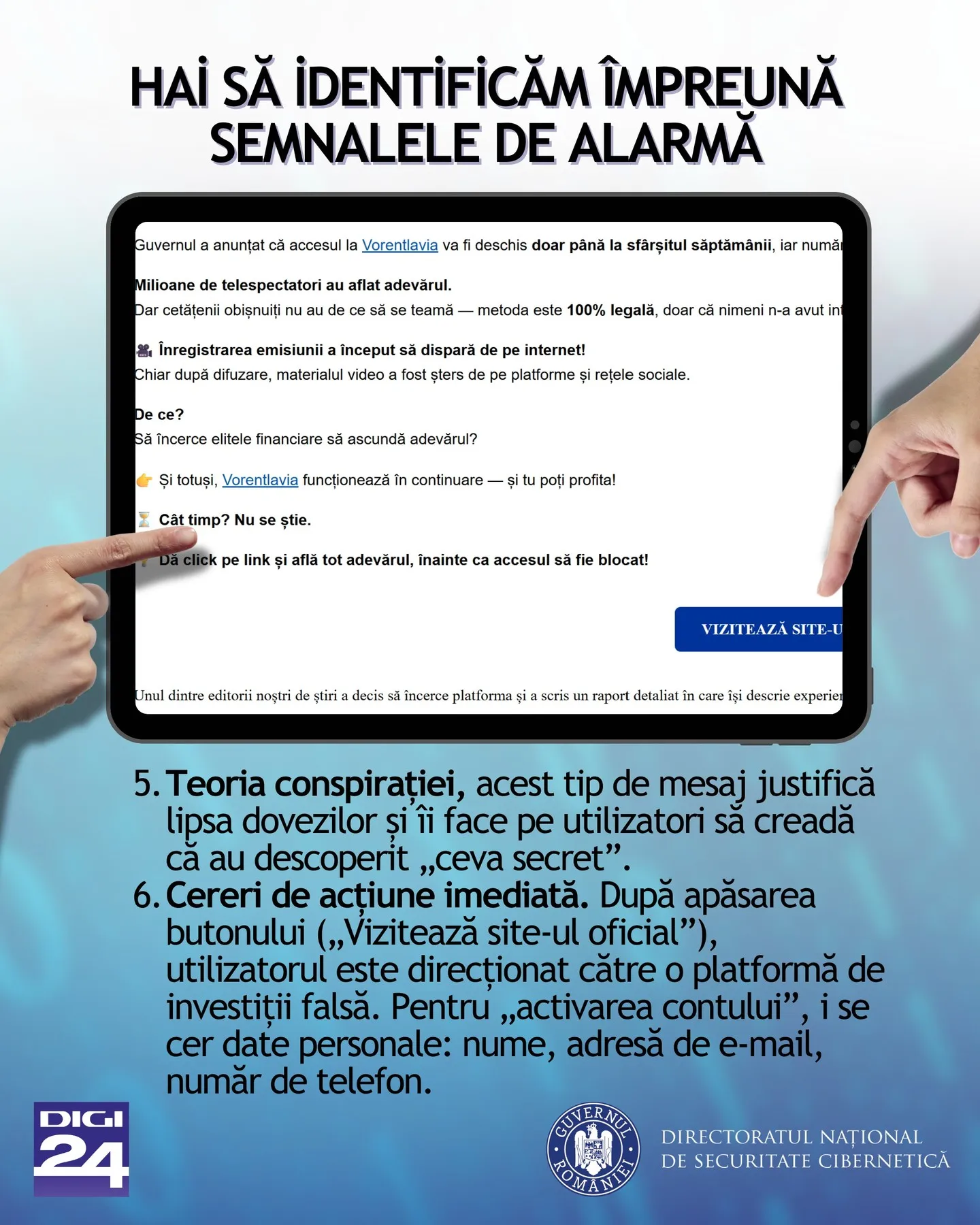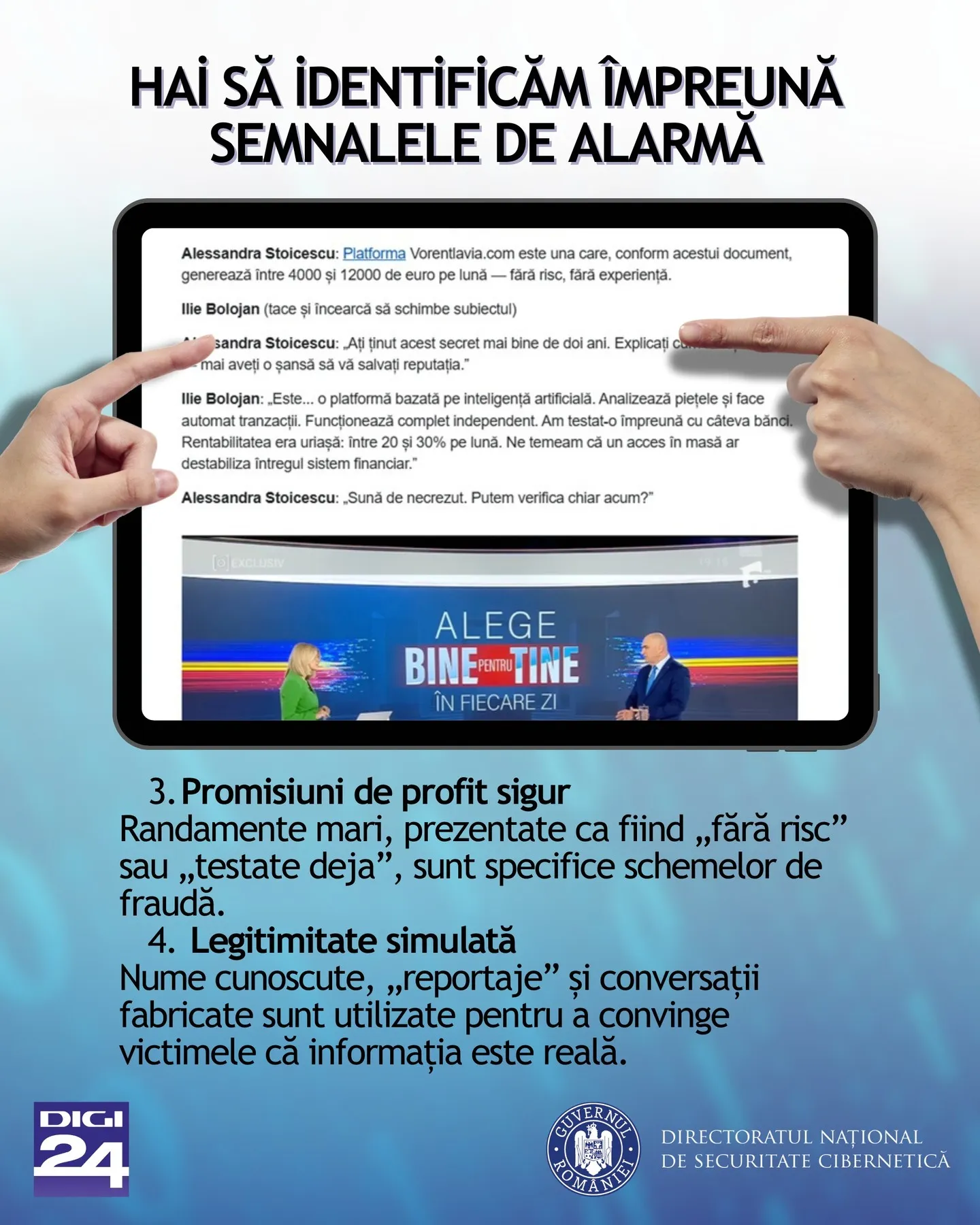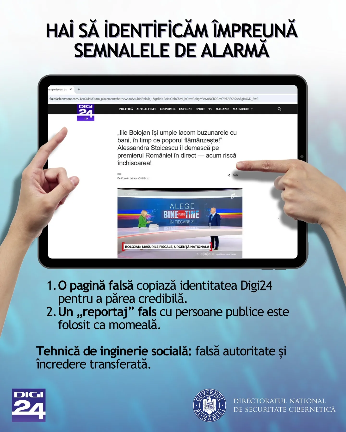 Un alt exemplu al acestei înșelătorii este dat de Directoratul Național de Securitate Cibernetică pe Instagram. Această înșelătorie folosește un site fake care imită Digi24.ro și titlul știrii este că Bolojan își umple lacom buzunarele în timp ce poporul flămânzește. Alessandra Stoicescu în demască în direct – acum riscă închisoarea.”