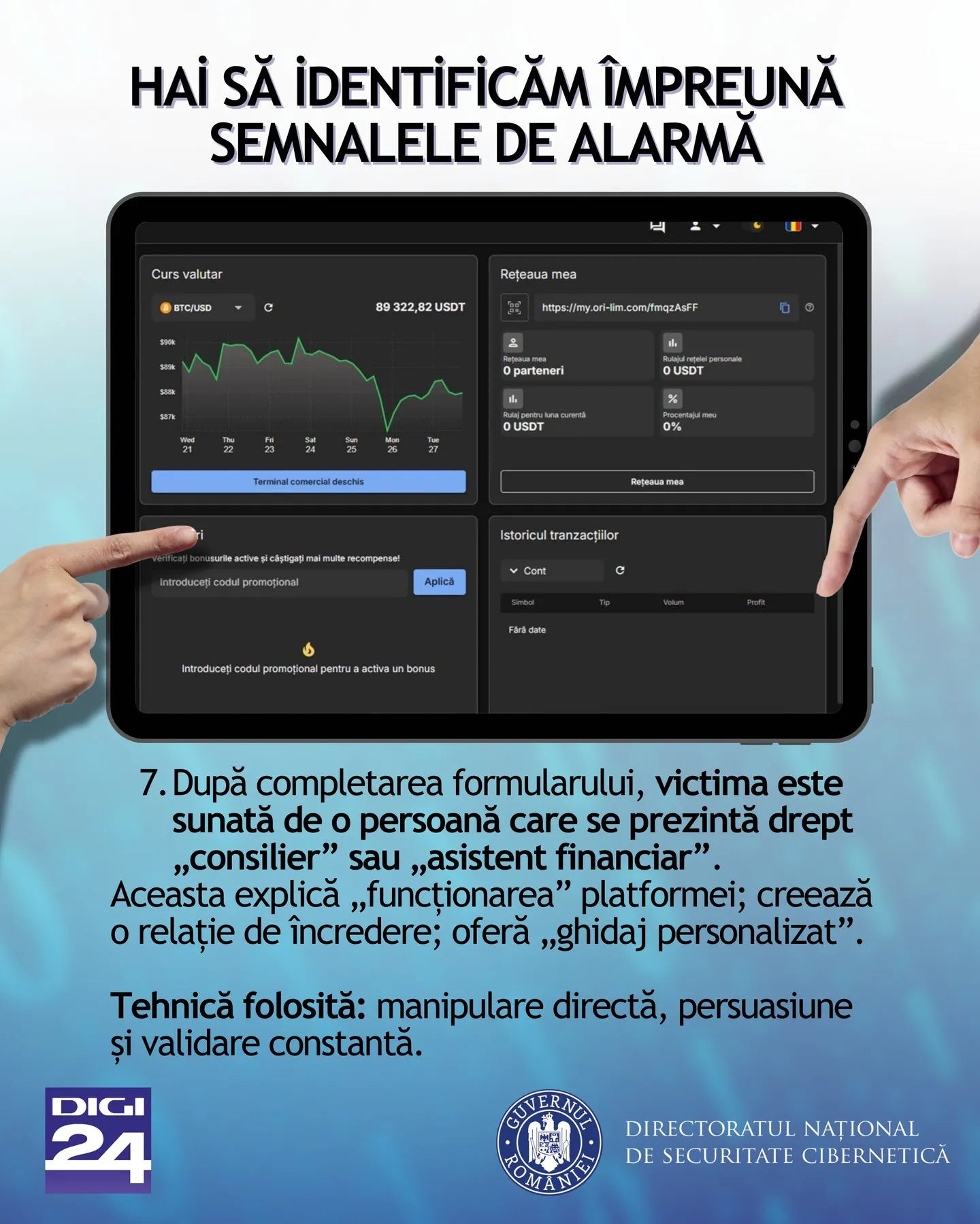 Se pare că, după ce te înscrii pe o astfel de platformă fake, de fapt un site de phishing, ești chiar sunat de o persoană care se recomandă drept manager de cont. Acesta îți câștigă încrederea la telefon, îți răspunde la întrebări, te ghidează despre cum să transferi bani undeva. Nu mi-e clar unde transferi banii, dar cu siguranță nu-i mai vezi niciodată.