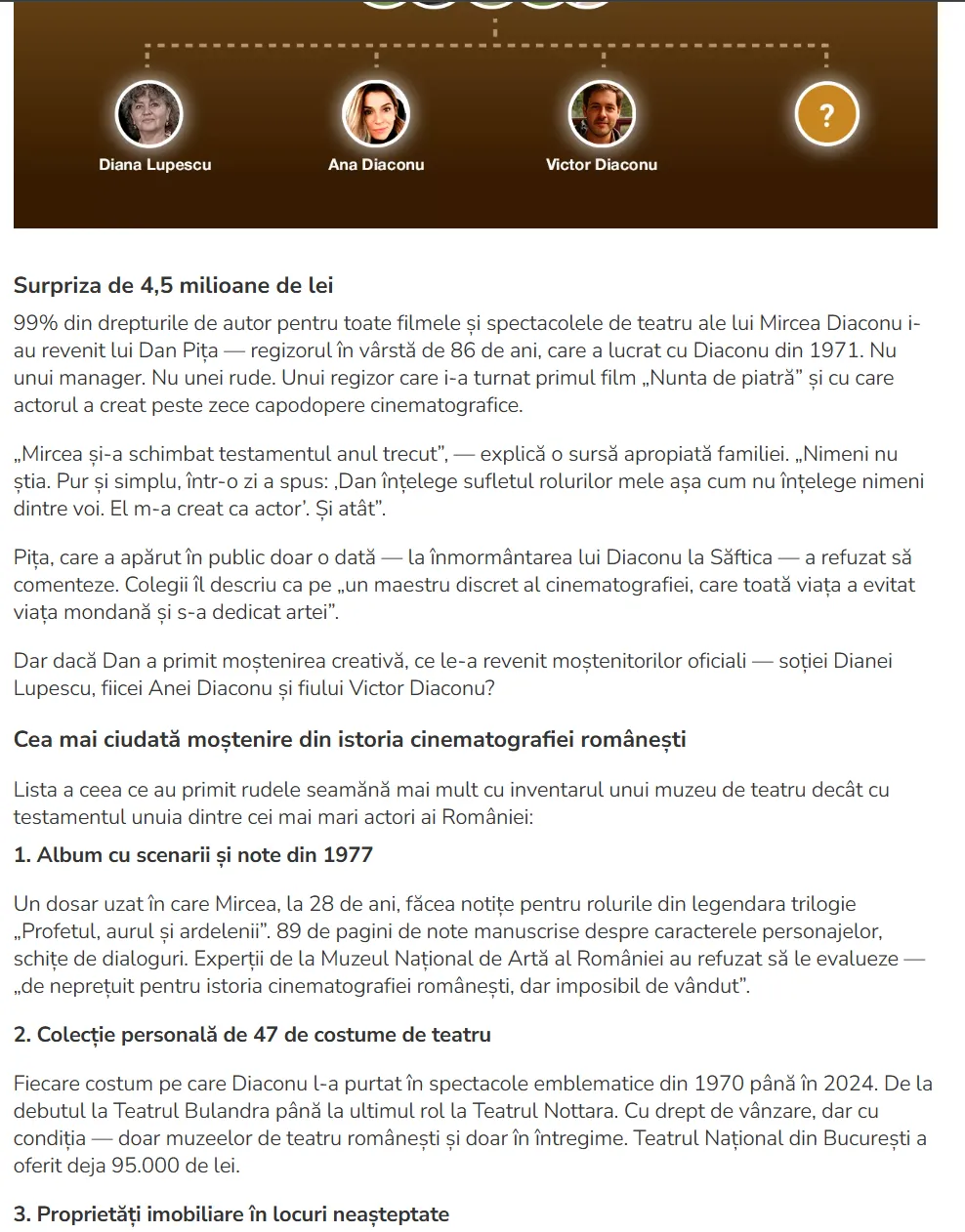 Articolul în sine este lung și, ca o înșelătorie care se respectă, nu te ia imediat cu “hai dă-ne banul”. Nu, întâi sunt cam două ecrane de text despre cine sunt moștenitorii lui Mircea Diaconu, ce avere le-a lăsat, cum s-a deschis testamentul și câte lacrimi avea fiecare membru al familiei sale în ochi.
