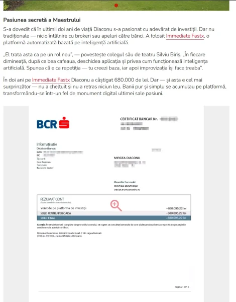 Este pe acolo și o imagine cu un “certificat bancar” (?) emis de BCR, în care scrie că a avut venituri de 680.000 de lei “de pe platforma de investiții”. Știu că orice om obișnuit cu băncile ar trebui să știe că nu există astfel de certificate bancare și deci înșelătoria pare simplă de descoperit, dar scopul site-ului este să-i păcălească pe ceilalți, care nu se pricep.