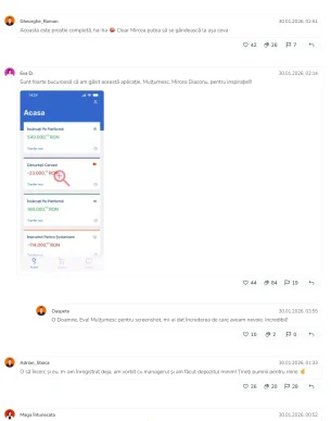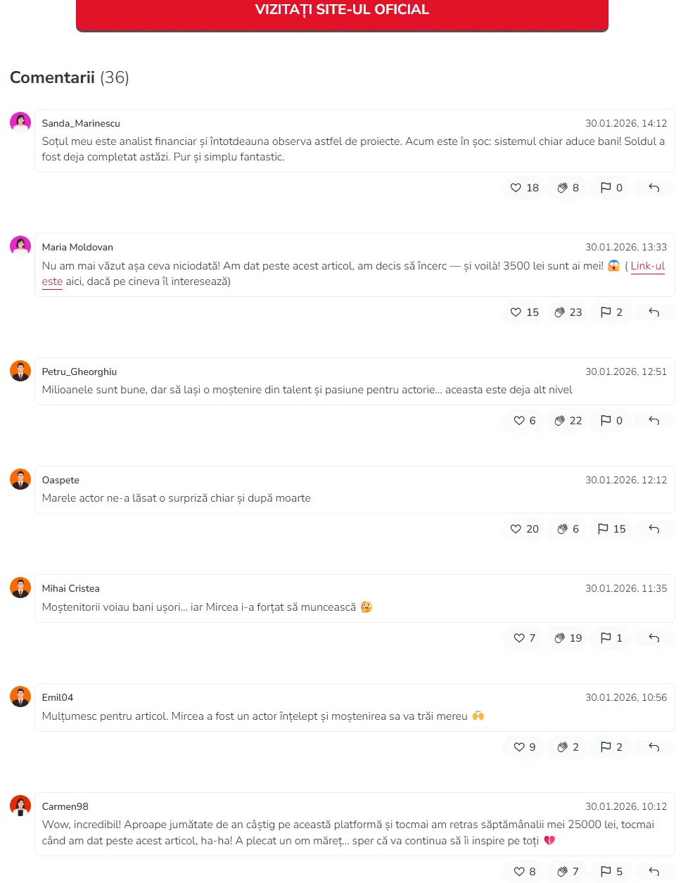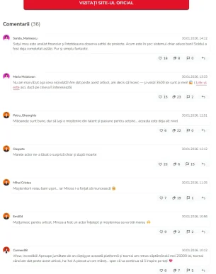 Sub articol urmează “comentarii” de la diverse persoane. Toate sunt de “astăzi”, toate confirmă că au câștigat bani mulți pe platformă sau se bucură că au descoperit-o grație maestrului Diaconu.