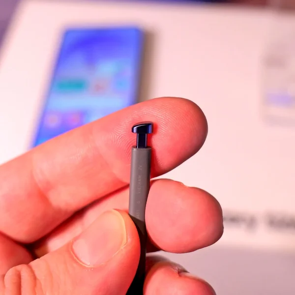 Spuneam că stylusul are o particularitate ciudată. S26 Ultra are în continuare stylus, din fericire, dar nu a revenit și conexiunea Bluetooth a acestuia, nu că m-aș fi așteptat la asta. Capătul stylusului este acum rotunjit într-o parte, ca să se integreze bine cu curbura mai mare a colțului telefonului, dar asta înseamnă că nu-l mai poți înfige în orice poziție în telefon.