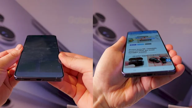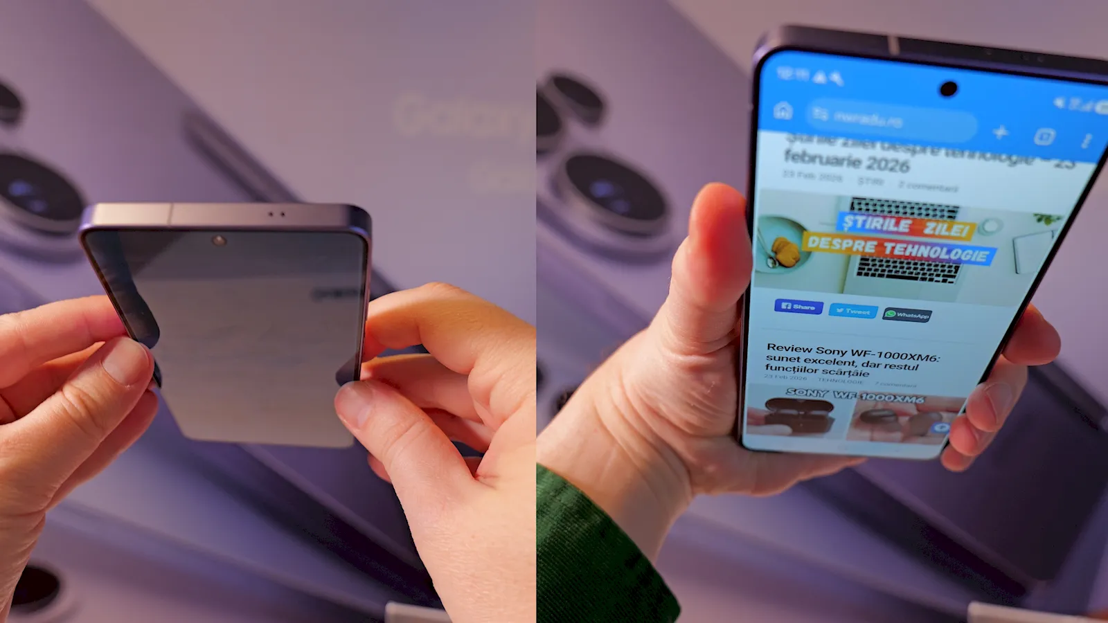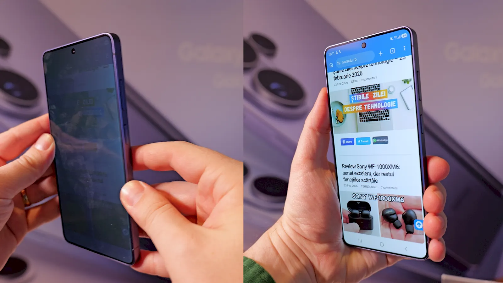 Fotografiile de mai jos sunt cu același telefon S26 Ultra, dar cu funcția ecran de confidențialitate activată și apoi dezactivată. Am încercat să potrivesc unghiurile în colaje.