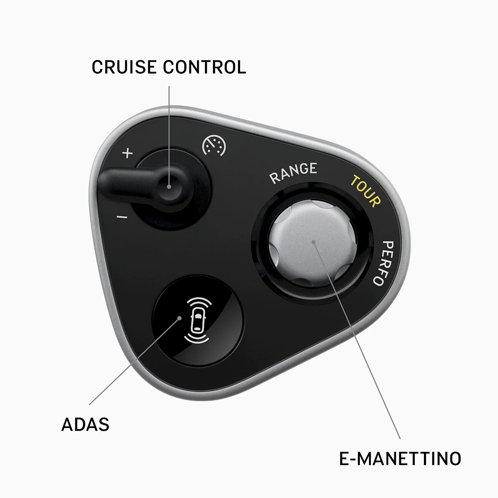 Volanul are tot felul de comutatoare pe el, inclusiv unul pentru schimbarea modului electric între Range, Tour și Performance, iar din dreapta poți ajusta suspensia și sistemele de stabilitate.