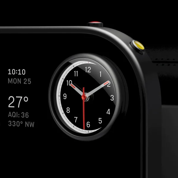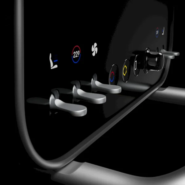 Bordul arată ca mai jos. Are guri de ventilație rotunde, multe butoane și comutatoare fizice, ecran în fața șoferului și un ecran mobil în centru. Acel ecran din centru are chiar un mâner amplu sub el, de care poți să tragi pentru a orienta ecranul mai spre tine.