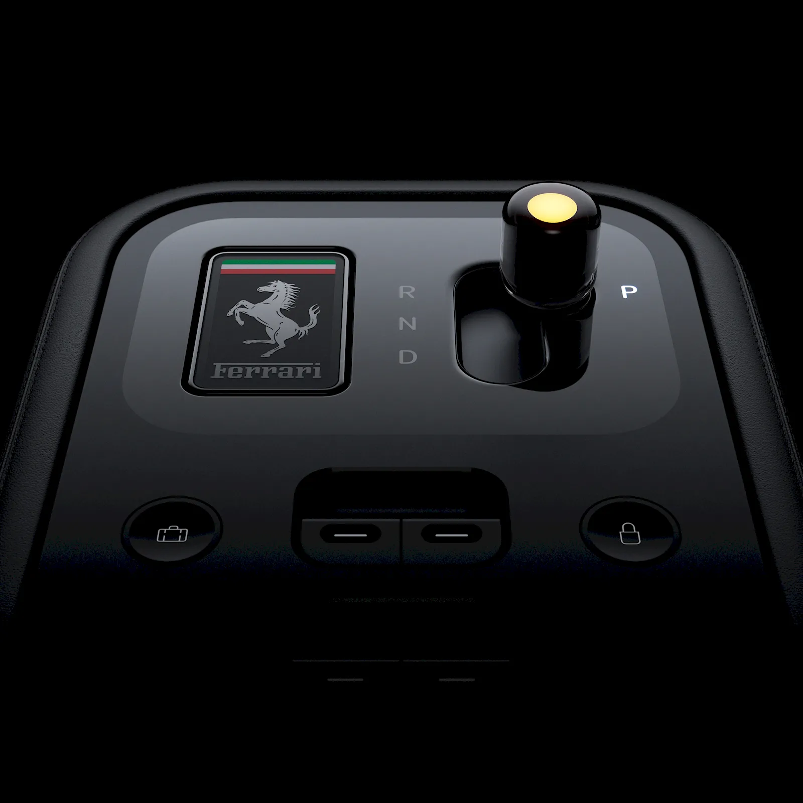 Pe centru, între scaune, se află micuțul schimbător de moduri, care are aspectul unui mic dop. Îmi aduce aminte de butoanele on/off din iOS. Zona aceea aproape că arată ca un iPhone, cu butoane discrete integrate la nivel cu suprafața. Vedeți acel dreptunghi în care scrie Ferrari? Aceea este de fapt cheia mașinii. Este o telecomandă clasică, cu butoane pe ea, de formă dreptunghiulară, iar când te urci în mașină o pui în acel locaș în care intră în totalitate, ceea ce activează mașina.