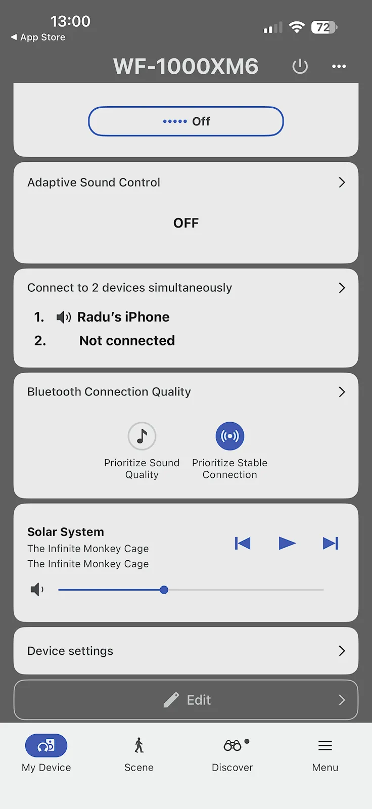 Apoi, modul de comutare automată între ambient sound mode și noise cancelling tot nu funcționează eficient. M-am plâns și în trecut de asta și problema rămâne, iar Sony nu cred că o observă. Acest mod de Adaptive Sound Control simte că mergi pe stradă și îți bagă în căști niște sunet ambiental, ca să auzi mai bine mașinile, să zicem. Te oprești pe loc, că poate aștepți la semafor? Comută pe Noise Cancelling, văzând că stai pe loc. Vorbește cineva cu tine? Ambient Sound la maxim, din nou. Mergi până la metrou? Ambient Sound on. Te urci în metrou și începe gălăgia? Noise Cancelling maxim!