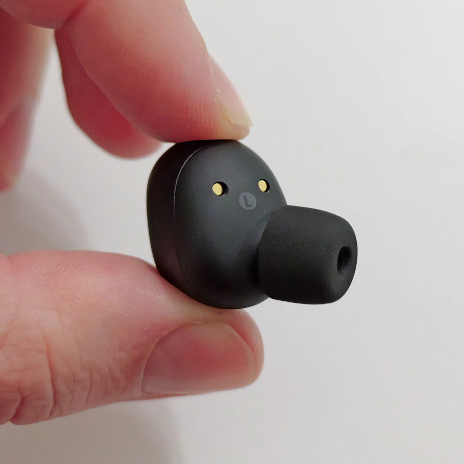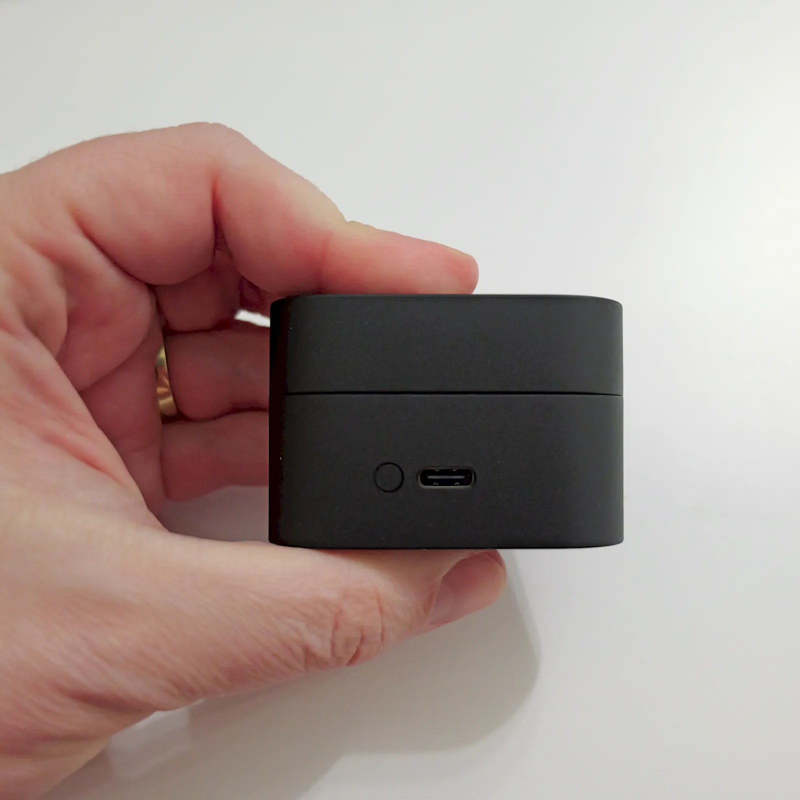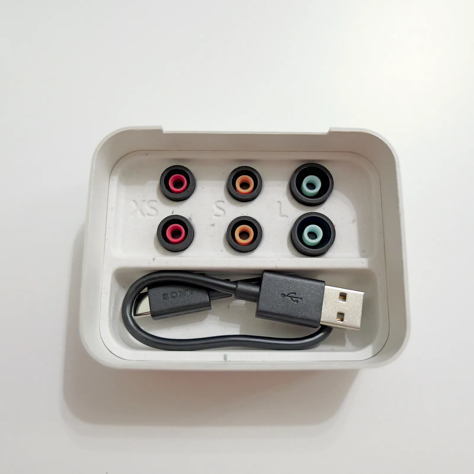 Vârful lor este dintr-un material memory foam destul de dur la apăsare. Primești în total 4 perechi de vârfuri, de la Extra-small la Large. Pachetul include și un mic cablu USB-A la USB-C, ceea ce m-a uimit. Cred că a cam trecut orice furnizor de gadgeturi la cabluri cu USB-C la ambele capete.