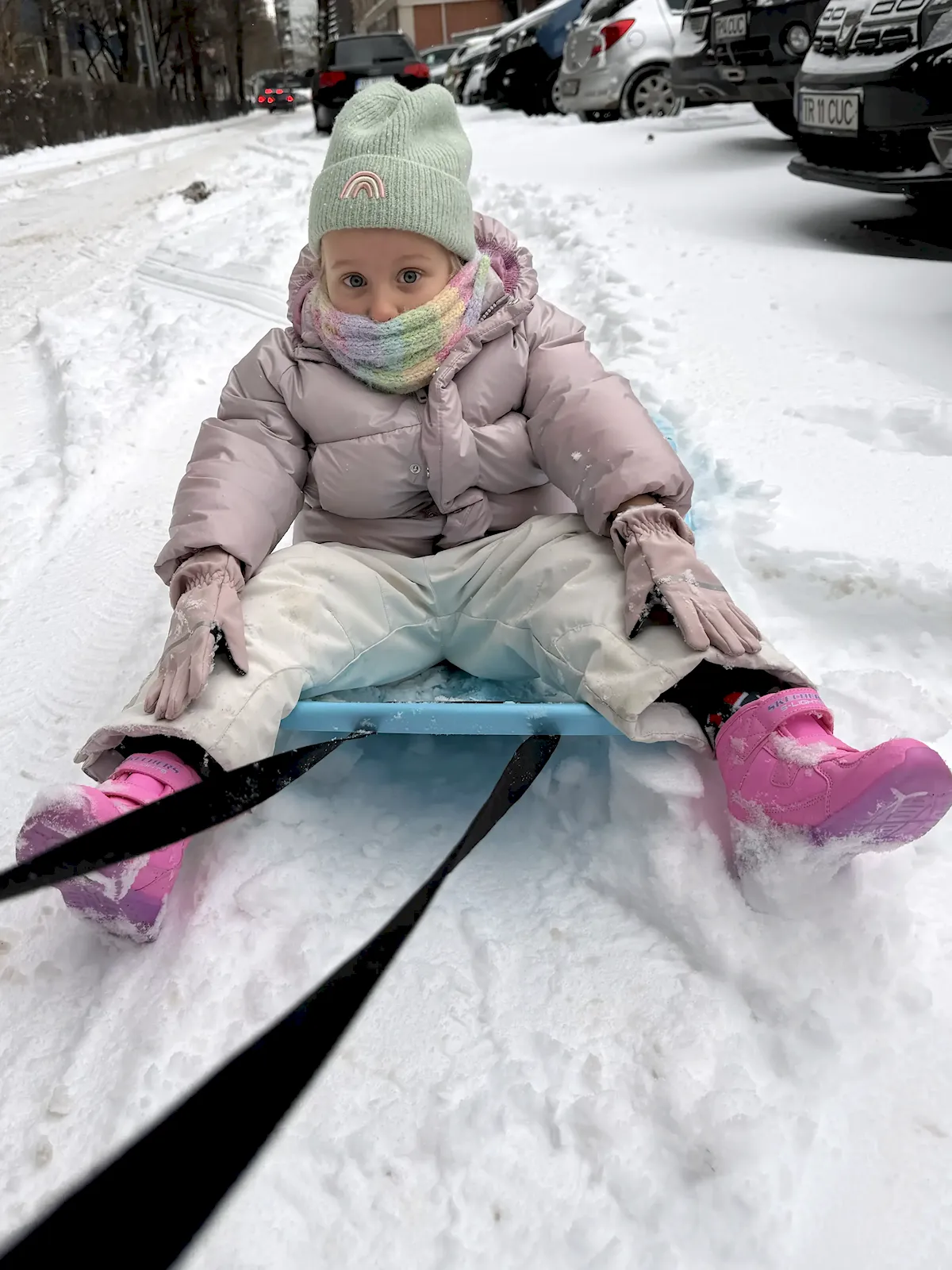 I-am comandat o sanie, a venit în vreo 10 zile și, din fericire, Alice a prins o zi cu zăpadă multă și am dus-o cu sania la grădiniță. I-am făcut o surpriză cu asta și a fost încântată. N-a fost mare iarnă în București, două zile de sanie până acum și nu cred că mai vin altele.