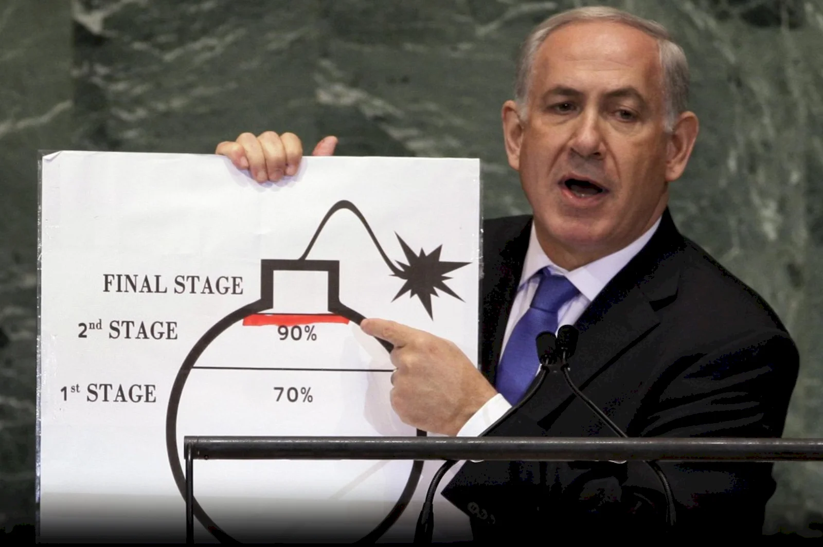 De asemenea, a avut și o schemă cu o bombă ca în desene animate, arătând că Iranul este foarte aproape de a dezvolta o bombă nucleară.