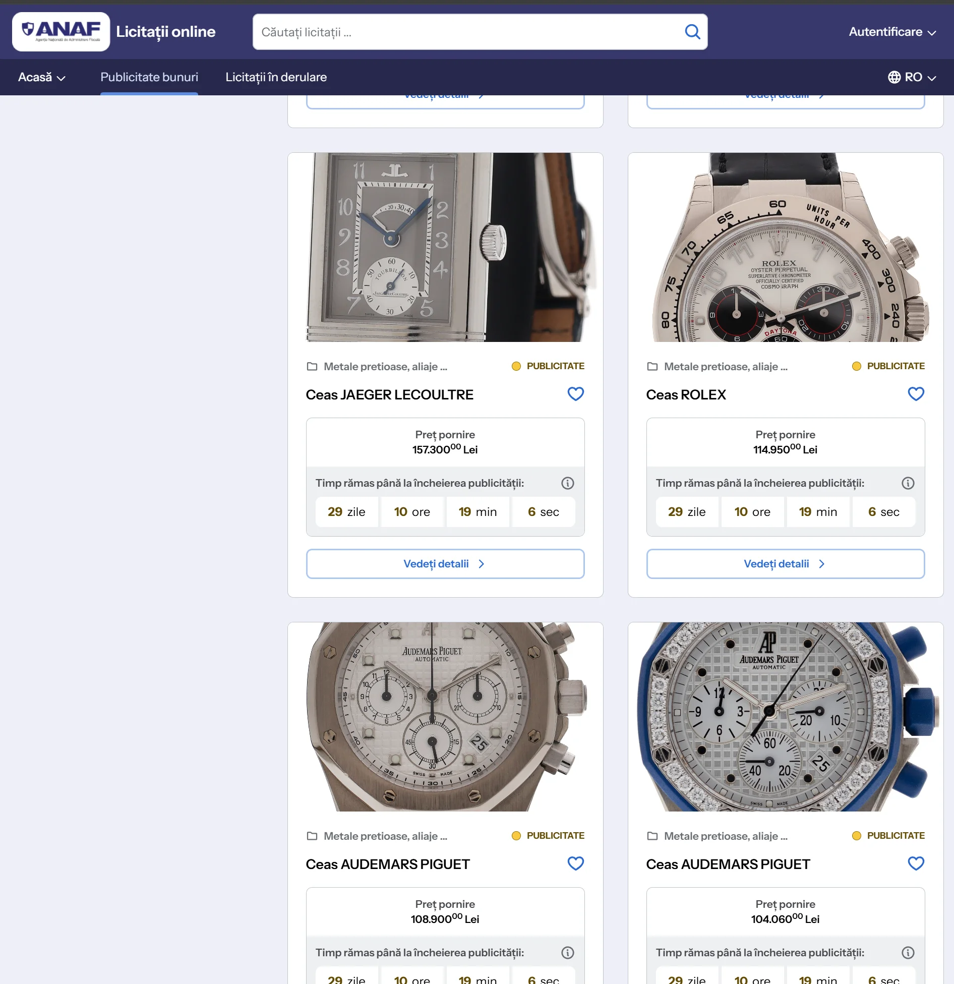 Ca idee, platforma elicitații funcționează în două etape. Bunurile sunt întâi listate într-o categorie numită Publicitate (știu, total neintuitiv) timp de 30 de zile(!), ca să le poată vedea cât mai mulți oameni și să decidă dacă vor sau nu să liciteze pentru ele. Apoi urmează desfășurarea licitației. Poți lăsa online oferte pentru fiecare bun ce intră în această etapă.