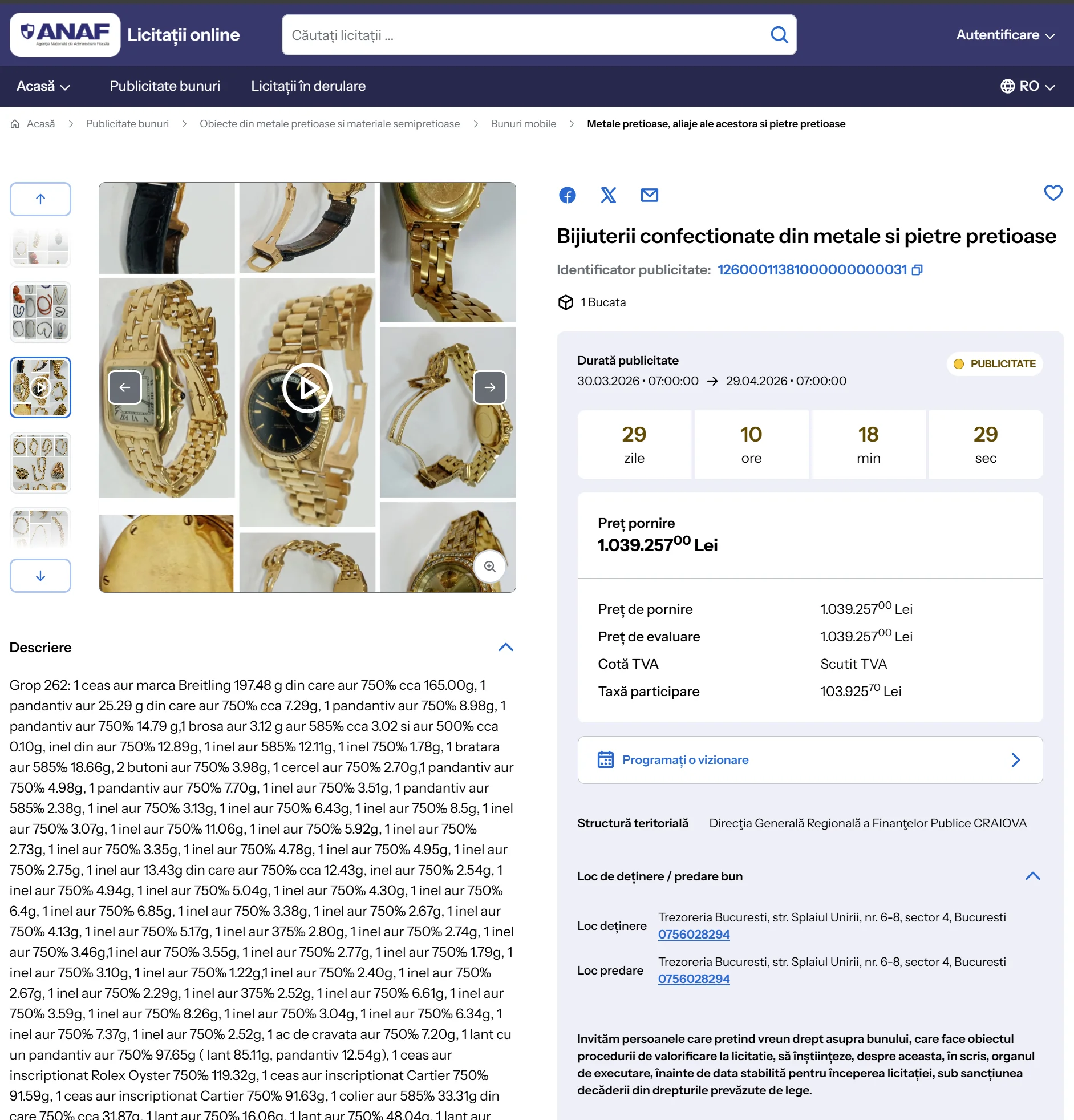 Sunt vreo 30 de bunuri listate momentan pe platformă. Incredibil pe ce sume stă ANAF. Au la vânzare un lot care conține 19,5 kilograme de aur, 2722 perle de cultură și 52 perle naturale, cu un preț de pornire de 10.284.000 lei (și da, trebuie să plătești un milion de lei în avans pentru a participa la licitație). Scrie acolo că sunt în inventarul ANAF Galați.