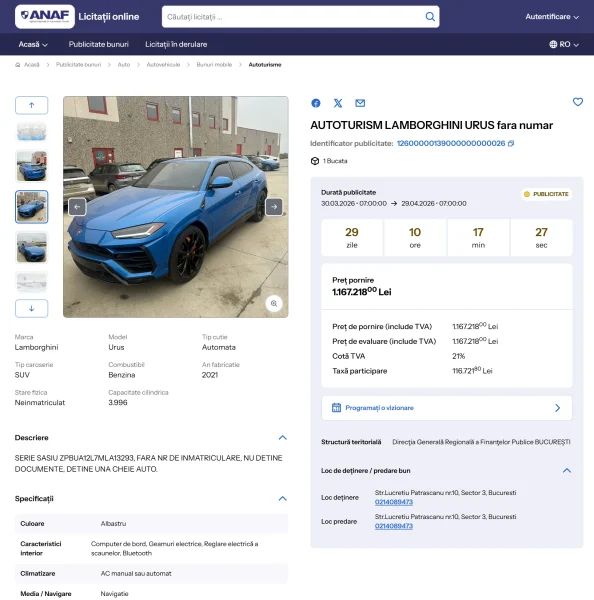 Mașina nu are nici un act, nu are număr de înmatriculare, are o singură cheie auto, este din 2021 și ANAF nici măcar nu precizează câți kilometri are la bord.