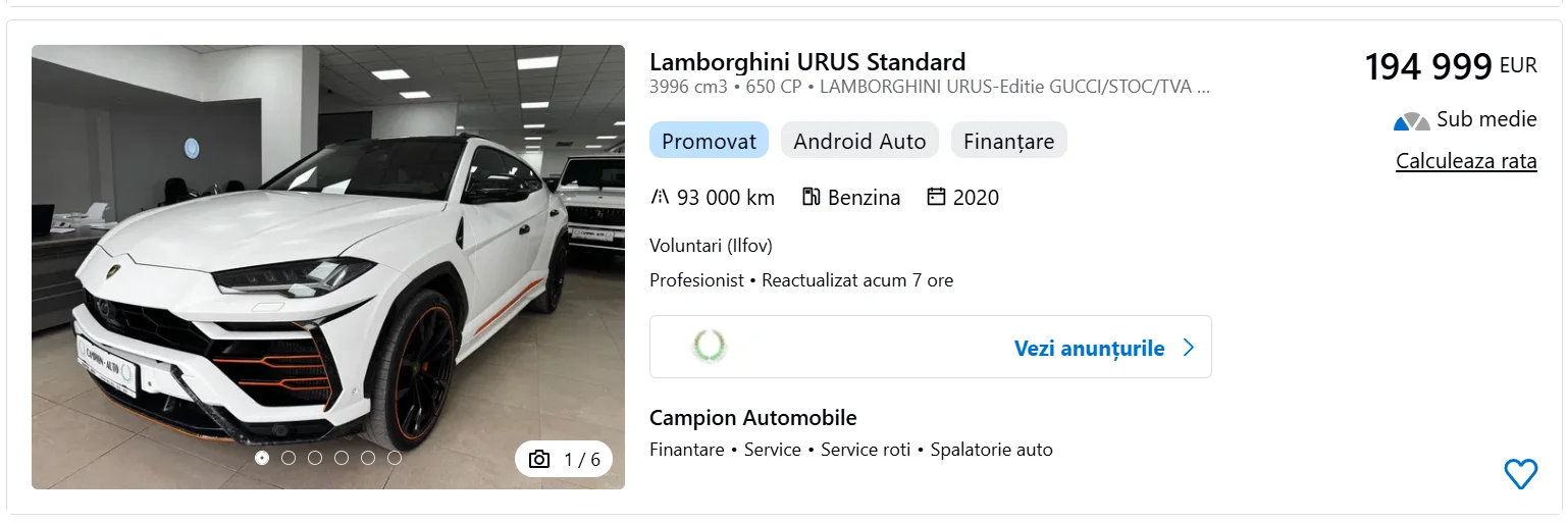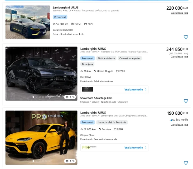 Ca idee, pe Autovit sunt la vânzare mai multe Lamborghini Urus la prețul de 200.000 de euro. Îmi închipui că toate au actele în regulă.