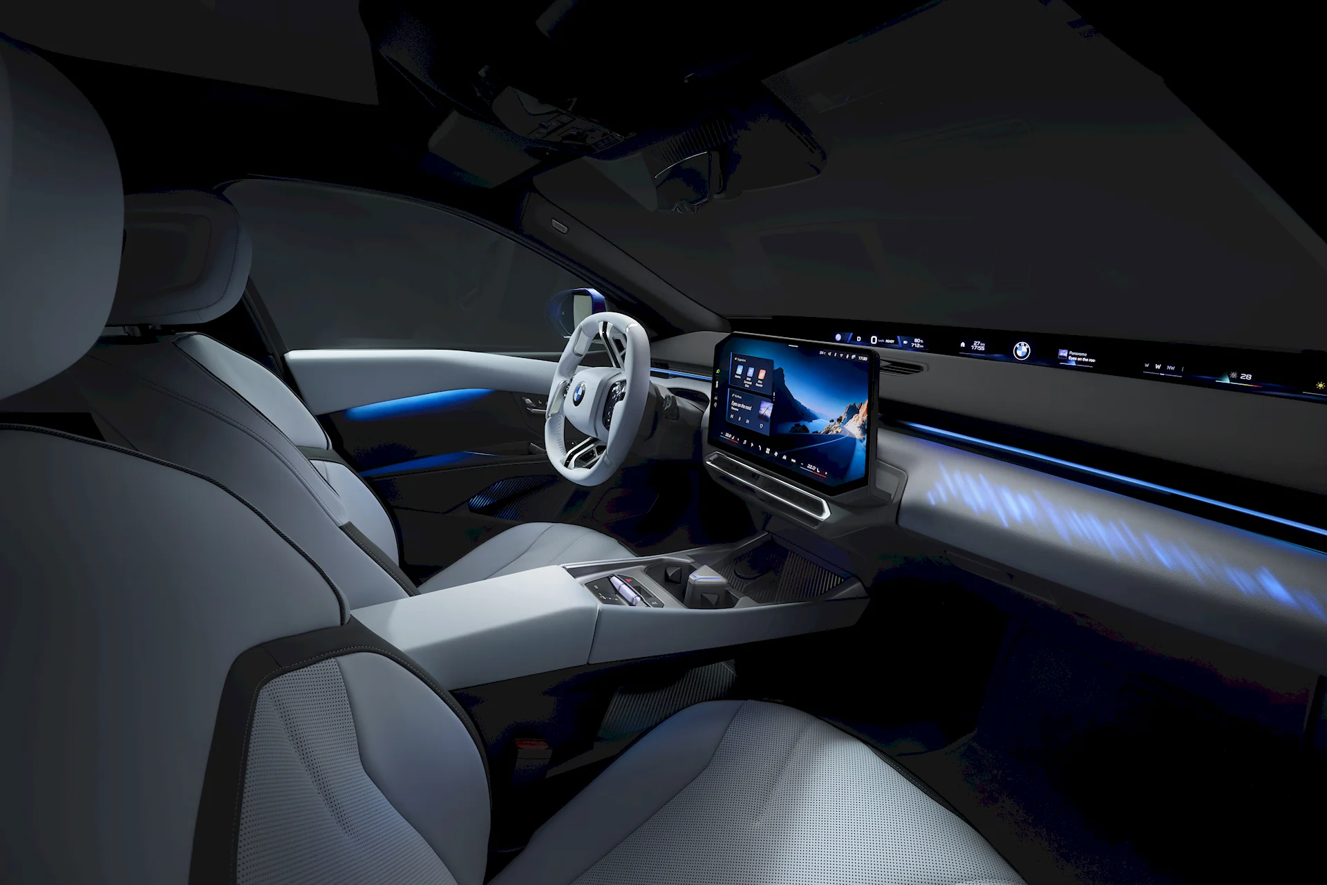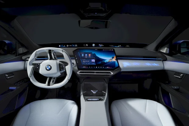 Interiorul are acel bord panoramic văzut și pe iX3, care mi se pare de asemenea o idee foarte bună, împreună cu un ecran mare în centru. Forma ecranului central mi se pare prea complexă, nu-i cazul să reinventăm dreptunghiul, ca să zic așa.