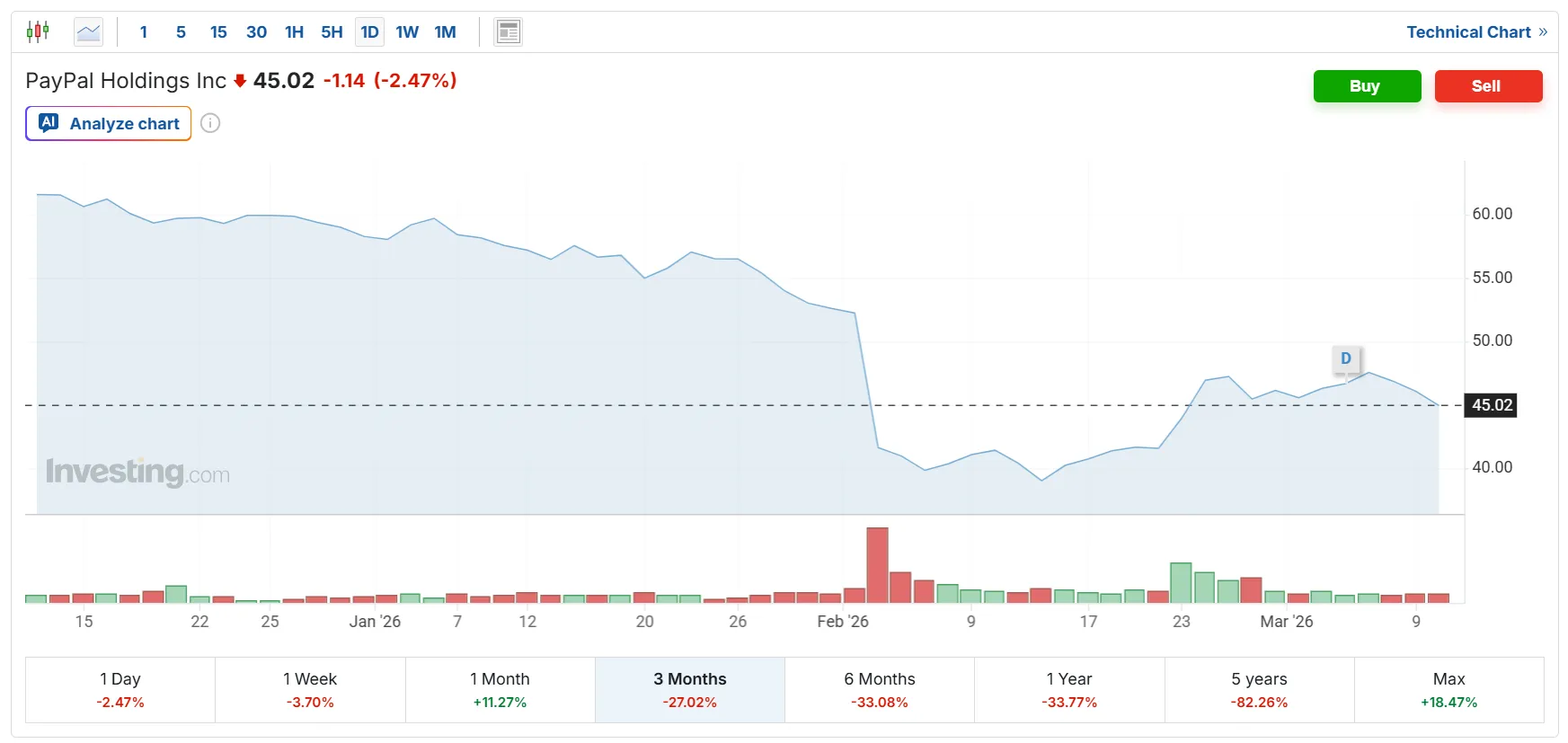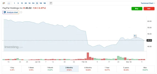PayPal este într-o scădere și mai mare de mai bine de un an. Nu știu exact de ce. Mi se pare că PayPal a avut un start excelent, dar apoi a ratat câteva ocazii de a deveni compania de facto pentru plăți. Inclusiv de la americani aud mai des că folosesc Venmo, nu PayPal, iar în curând intră tare Revolut pe piața lor.